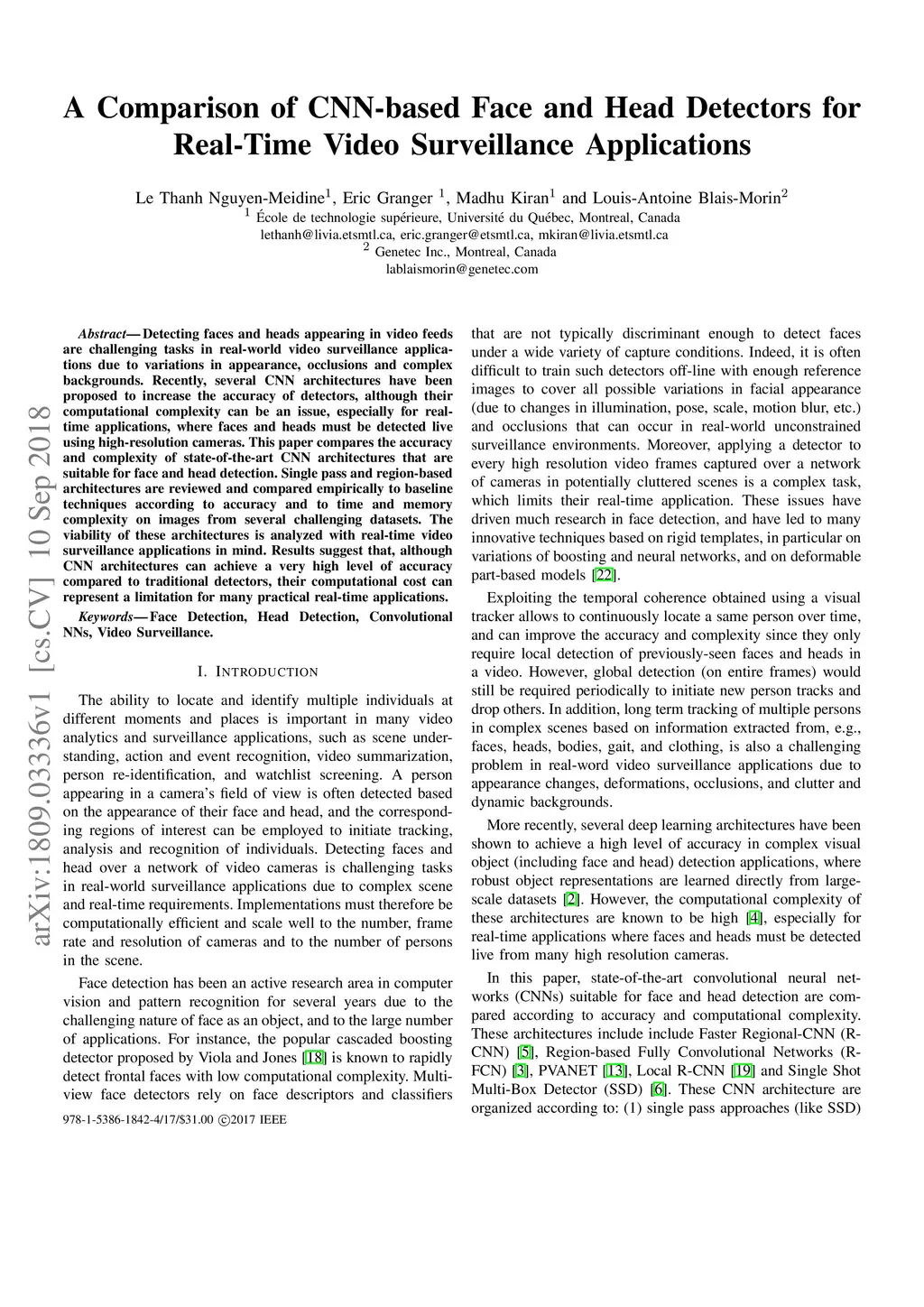 Detecting faces and heads appearing in video feeds are challenging tasks in real-world video surveillance applications due to variations in appearance, occlusions and complex backgrounds. Recently, several CNN architectures have been proposed to increase the accuracy of detectors, although their computational complexity can be an issue, especially for real-time applications, where faces and heads must be detected live using high-resolution cameras. This paper compares the accuracy and complexity of state-of-the-art CNN architectures that are suitable for face and head detection. Single pass and region-based architectures are reviewed and compared empirically to baseline techniques according to accuracy and to time and memory complexity on images from several challenging datasets. The viability of these architectures is analyzed with real-time video surveillance applications in mind. Results suggest that, although CNN architectures can achieve a very high level of accuracy compared to traditional detectors, their computational cost can represent a limitation for many practical real-time applications.