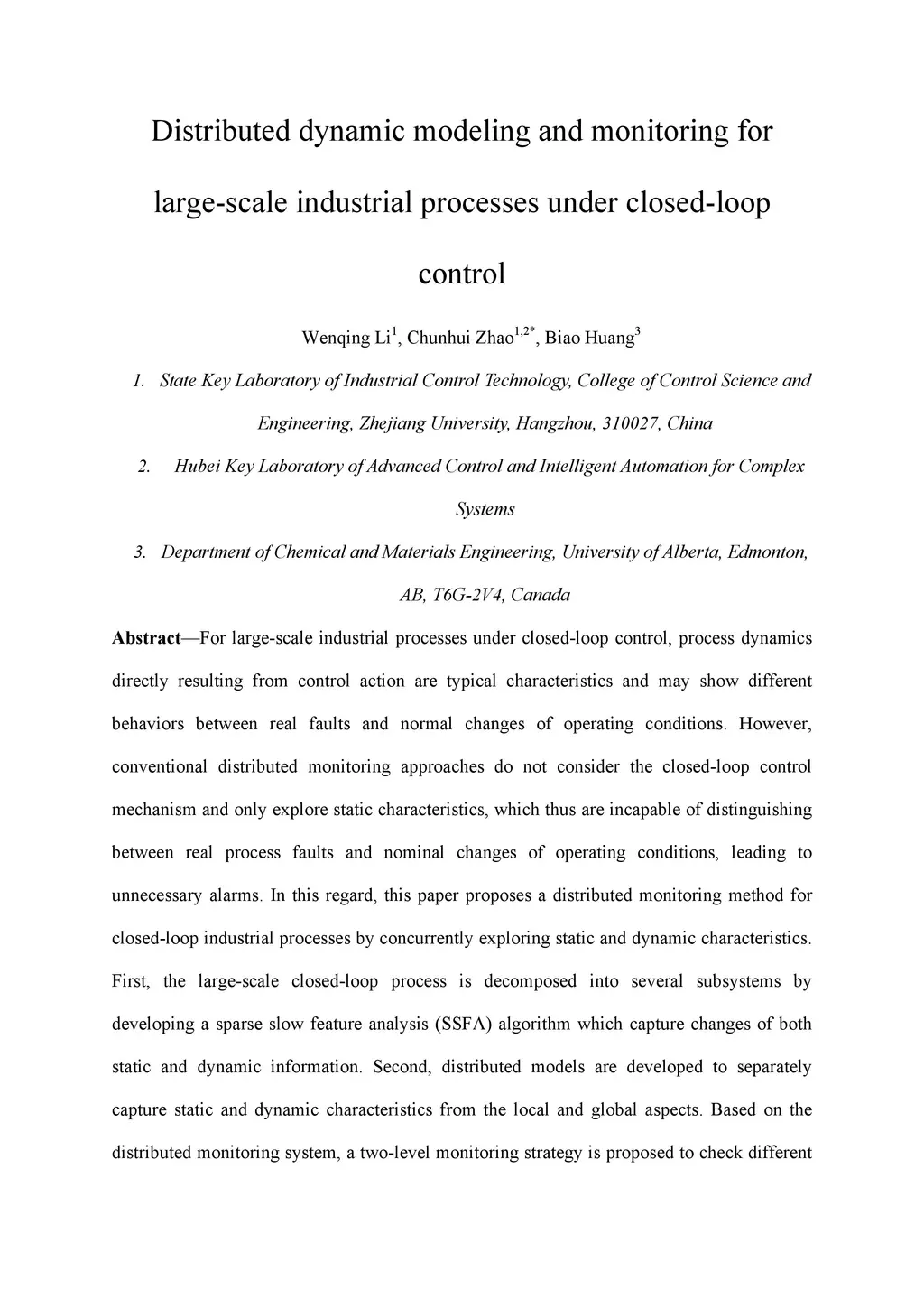 For large-scale industrial processes under closed-loop control, process dynamics directly resulting from control action are typical characteristics and may show different behaviors between real faults and normal changes of operating conditions. However, conventional distributed monitoring approaches do not consider the closed-loop control mechanism and only explore static characteristics, which thus are incapable of distinguishing between real process faults and nominal changes of operating conditions, leading to unnecessary alarms. In this regard, this paper proposes a distributed monitoring method for closed-loop industrial processes by concurrently exploring static and dynamic characteristics. First, the large-scale closed-loop process is decomposed into several subsystems by developing a sparse slow feature analysis (SSFA) algorithm which capture changes of both static and dynamic information. Second, distributed models are developed to separately capture static and dynamic characteristics from the local and global aspects. Based on the distributed monitoring system, a two-level monitoring strategy is proposed to check different influences on process characteristics resulting from changes of the operating conditions and control action, and thus the two changes can be well distinguished from each other. Case studies are conducted based on both benchmark data and real industrial process data to illustrate the effectiveness of the proposed method.
