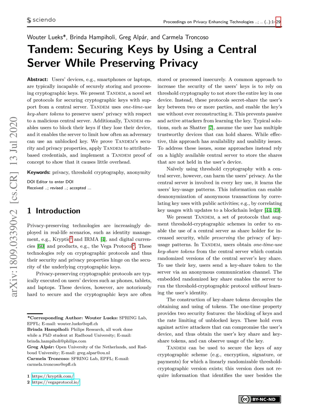 Tandem: Securing Keys by Using a Central Server While Preserving Privacy