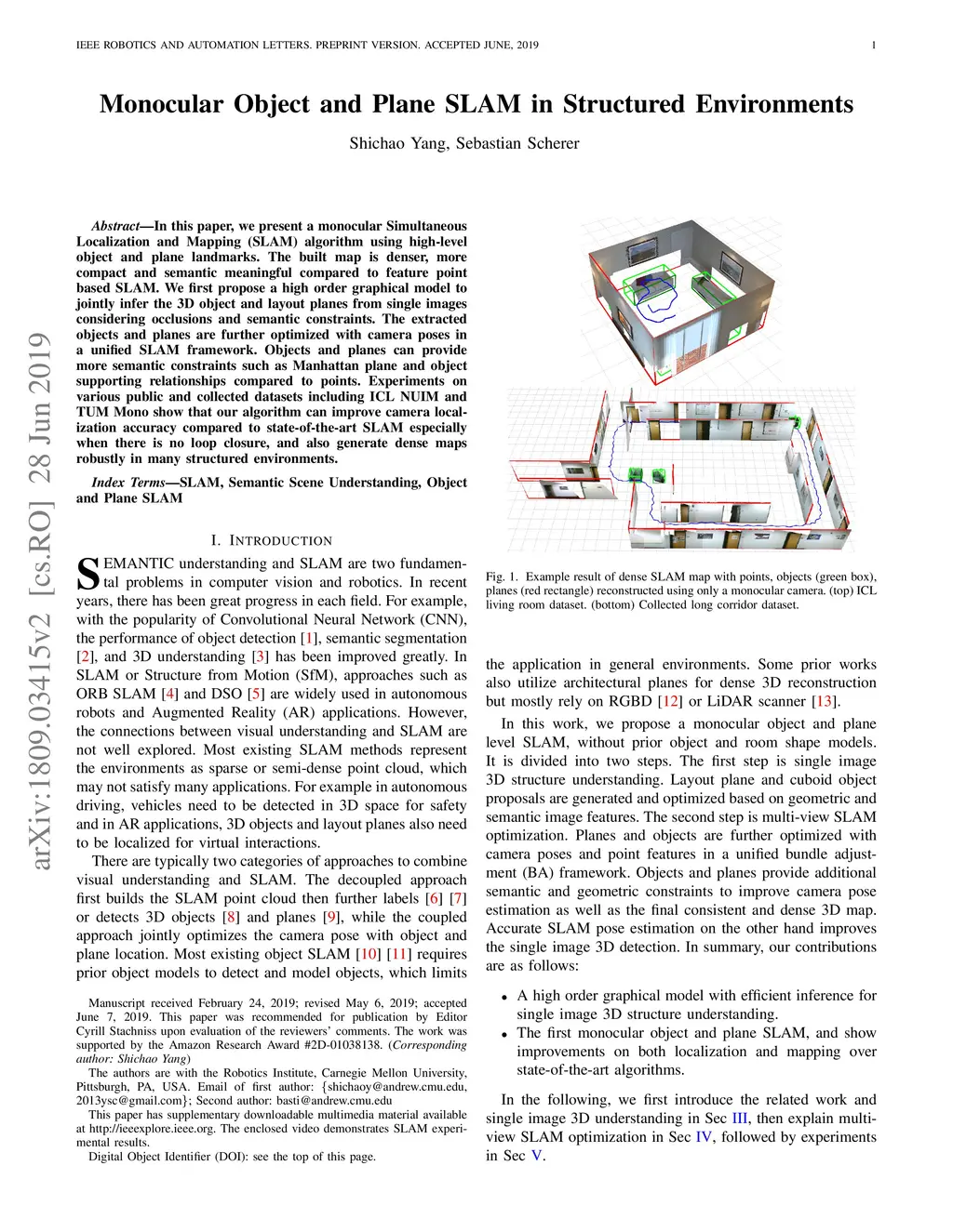 In this paper, we present a monocular Simultaneous Localization and Mapping (SLAM) algorithm using high-level object and plane landmarks. The built map is denser, more compact and semantic meaningful compared to feature point based SLAM. We first propose a high order graphical model to jointly infer the 3D object and layout planes from single images considering occlusions and semantic constraints. The extracted objects and planes are further optimized with camera poses in a unified SLAM framework. Objects and planes can provide more semantic constraints such as Manhattan plane and object supporting relationships compared to points. Experiments on various public and collected datasets including ICL NUIM and TUM Mono show that our algorithm can improve camera localization accuracy compared to state-of-the-art SLAM especially when there is no loop closure, and also generate dense maps robustly in many structured environments.