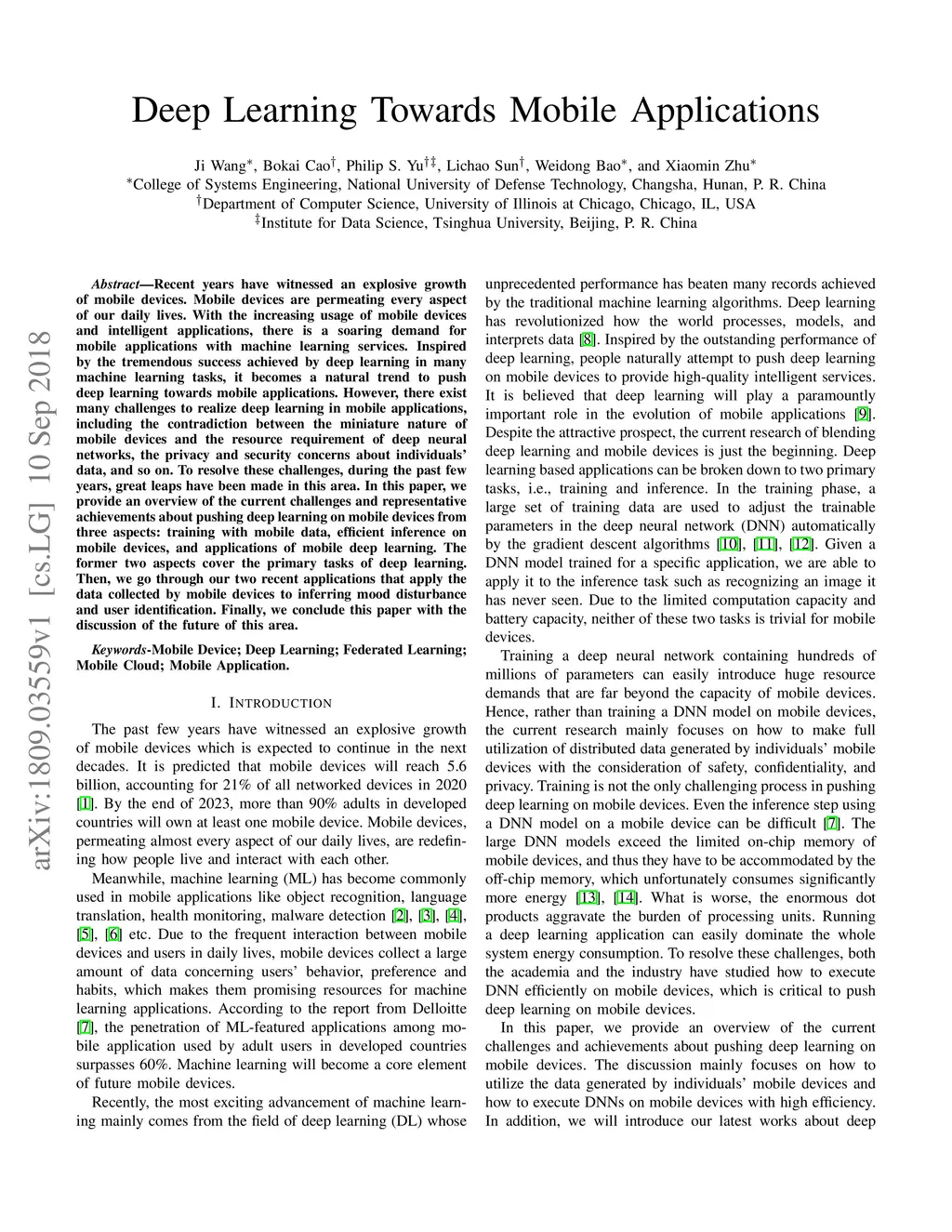 Recent years have witnessed an explosive growth of mobile devices. Mobile devices are permeating every aspect of our daily lives. With the increasing usage of mobile devices and intelligent applications, there is a soaring demand for mobile applications with machine learning services. Inspired by the tremendous success achieved by deep learning in many machine learning tasks, it becomes a natural trend to push deep learning towards mobile applications. However, there exist many challenges to realize deep learning in mobile applications, including the contradiction between the miniature nature of mobile devices and the resource requirement of deep neural networks, the privacy and security concerns about individuals' data, and so on. To resolve these challenges, during the past few years, great leaps have been made in this area. In this paper, we provide an overview of the current challenges and representative achievements about pushing deep learning on mobile devices from three aspects: training with mobile data, efficient inference on mobile devices, and applications of mobile deep learning. The former two aspects cover the primary tasks of deep learning. Then, we go through our two recent applications that apply the data collected by mobile devices to inferring mood disturbance and user identification. Finally, we conclude this paper with the discussion of the future of this area.