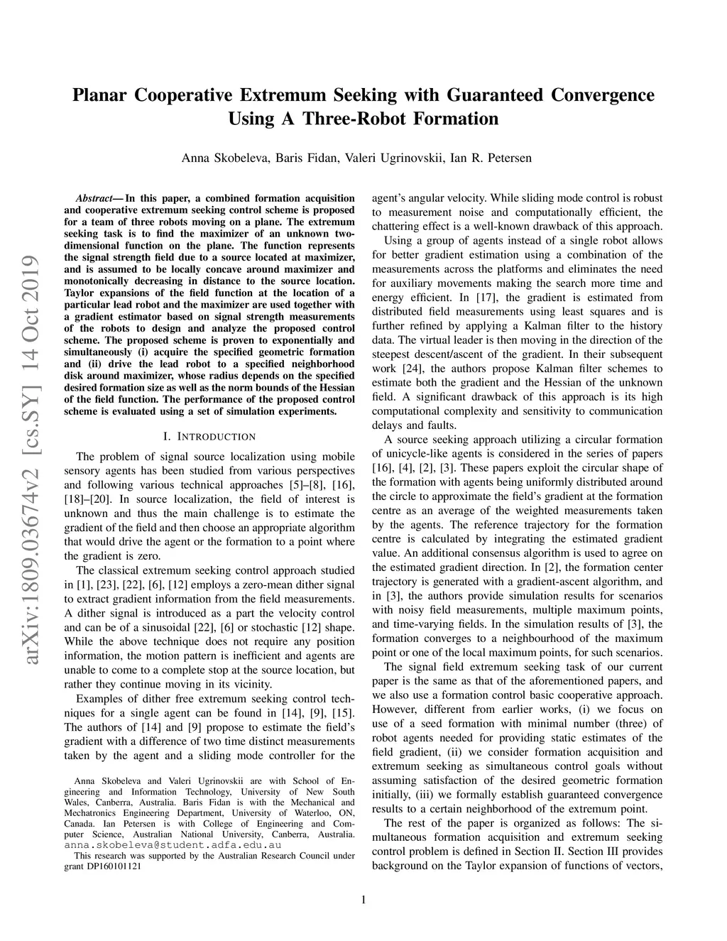 In this paper, a combined formation acquisition and cooperative extremum seeking control scheme is proposed for a team of three robots moving on a plane. The extremum seeking task is to find the maximizer of an unknown two-dimensional function on the plane. The function represents the signal strength field due to a source located at maximizer, and is assumed to be locally concave around maximizer and monotonically decreasing in distance to the source location. Taylor expansions of the field function at the location of a particular lead robot and the maximizer are used together with a gradient estimator based on signal strength measurements of the robots to design and analyze the proposed control scheme. The proposed scheme is proven to exponentially and simultaneously (i) acquire the specified geometric formation and (ii) drive the lead robot to a specified neighborhood disk around maximizer, whose radius depends on the specified desired formation size as well as the norm bounds of the Hessian of the field function. The performance of the proposed control scheme is evaluated using a set of simulation experiments.