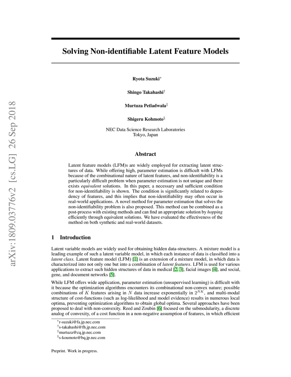 Latent feature models (LFM)s are widely employed for extracting latent structures of data. While offering high, parameter estimation is difficult with LFMs because of the combinational nature of latent features, and non-identifiability is a particularly difficult problem when parameter estimation is not unique and there exists equivalent solutions. In this paper, a necessary and sufficient condition for non-identifiability is shown. The condition is significantly related to dependency of features, and this implies that non-identifiability may often occur in real-world applications. A novel method for parameter estimation that solves the non-identifiability problem is also proposed. This method can be combined as a post-process with existing methods and can find an appropriate solution by hopping efficiently through equivalent solutions. We have evaluated the effectiveness of the method on both synthetic and real-world datasets.