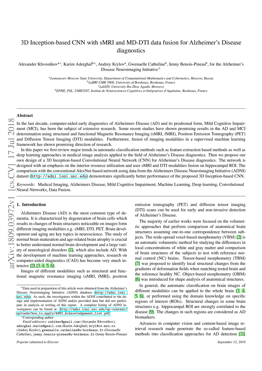 3D Inception-based CNN with sMRI and MD-DTI data fusion for Alzheimer's