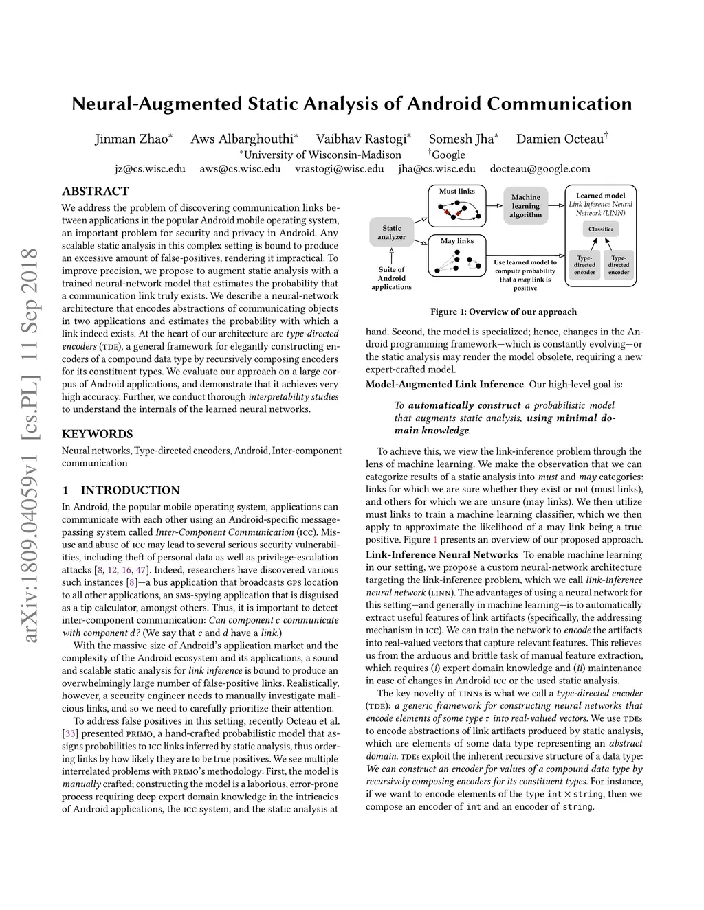 We address the problem of discovering communication links between applications in the popular Android mobile operating system, an important problem for security and privacy in Android. Any scalable static analysis in this complex setting is bound to produce an excessive amount of false-positives, rendering it impractical. To improve precision, we propose to augment static analysis with a trained neural-network model that estimates the probability that a communication link truly exists. We describe a neural-network architecture that encodes abstractions of communicating objects in two applications and estimates the probability with which a link indeed exists. At the heart of our architecture are type-directed encoders (TDE), a general framework for elegantly constructing encoders of a compound data type by recursively composing encoders for its constituent types. We evaluate our approach on a large corpus of Android applications, and demonstrate that it achieves very high accuracy. Further, we conduct thorough interpretability studies to understand the internals of the learned neural networks.