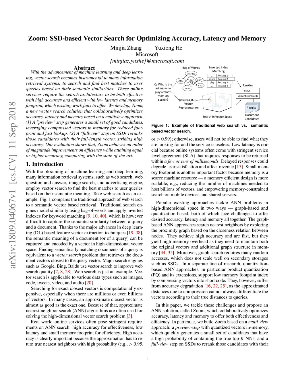 With the advancement of machine learning and deep learning, vector search becomes instrumental to many information retrieval systems, to search and find best matches to user queries based on their semantic similarities.These online services require the search architecture to be both effective with high accuracy and efficient with low latency and memory footprint, which existing work fails to offer. We develop, Zoom, a new vector search solution that collaboratively optimizes accuracy, latency and memory based on a multiview approach. (1) A "preview" step generates a small set of good candidates, leveraging compressed vectors in memory for reduced footprint and fast lookup. (2) A "fullview" step on SSDs reranks those candidates with their full-length vector, striking high accuracy. Our evaluation shows that, Zoom achieves an order of magnitude improvements on efficiency while attaining equal or higher accuracy, comparing with the state-of-the-art.