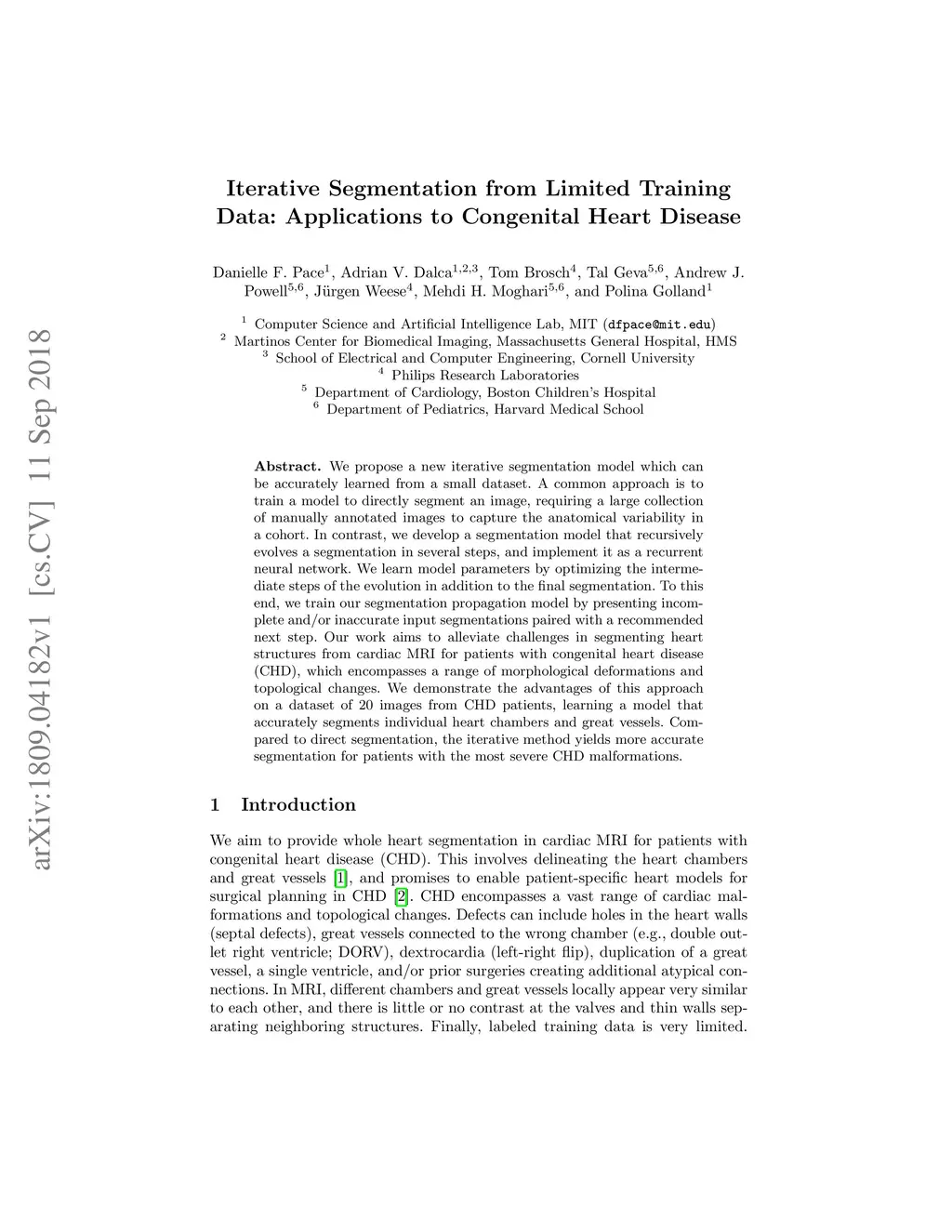 We propose a new iterative segmentation model which can be accurately learned from a small dataset. A common approach is to train a model to directly segment an image, requiring a large collection of manually annotated images to capture the anatomical variability in a cohort. In contrast, we develop a segmentation model that recursively evolves a segmentation in several steps, and implement it as a recurrent neural network. We learn model parameters by optimizing the interme- diate steps of the evolution in addition to the final segmentation. To this end, we train our segmentation propagation model by presenting incom- plete and/or inaccurate input segmentations paired with a recommended next step. Our work aims to alleviate challenges in segmenting heart structures from cardiac MRI for patients with congenital heart disease (CHD), which encompasses a range of morphological deformations and topological changes. We demonstrate the advantages of this approach on a dataset of 20 images from CHD patients, learning a model that accurately segments individual heart chambers and great vessels. Com- pared to direct segmentation, the iterative method yields more accurate segmentation for patients with the most severe CHD malformations.