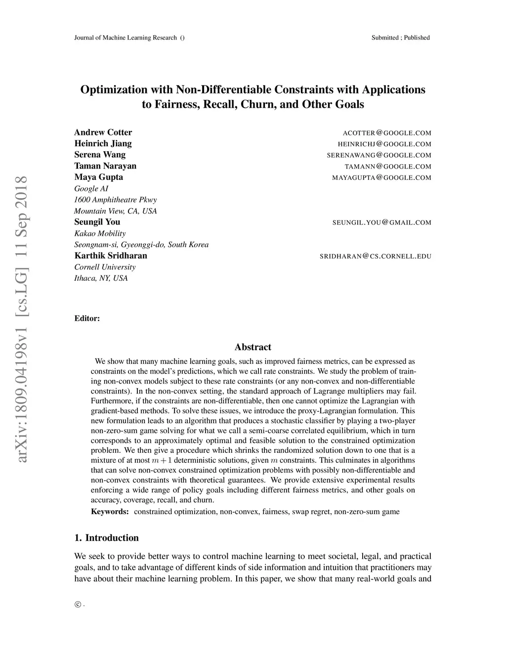 We show that many machine learning goals, such as improved fairness metrics, can be expressed as constraints on the model's predictions, which we call rate constraints. We study the problem of training non-convex models subject to these rate constraints (or any non-convex and non-differentiable constraints). In the non-convex setting, the standard approach of Lagrange multipliers may fail. Furthermore, if the constraints are non-differentiable, then one cannot optimize the Lagrangian with gradient-based methods. To solve these issues, we introduce the proxy-Lagrangian formulation. This new formulation leads to an algorithm that produces a stochastic classifier by playing a two-player non-zero-sum game solving for what we call a semi-coarse correlated equilibrium, which in turn corresponds to an approximately optimal and feasible solution to the constrained optimization problem. We then give a procedure which shrinks the randomized solution down to one that is a mixture of at most deterministic solutions, given constraints. This culminates in algorithms that can solve non-convex constrained optimization problems with possibly non-differentiable and non-convex constraints with theoretical guarantees. We provide extensive experimental results enforcing a wide range of policy goals including different fairness metrics, and other goals on accuracy, coverage, recall, and churn.