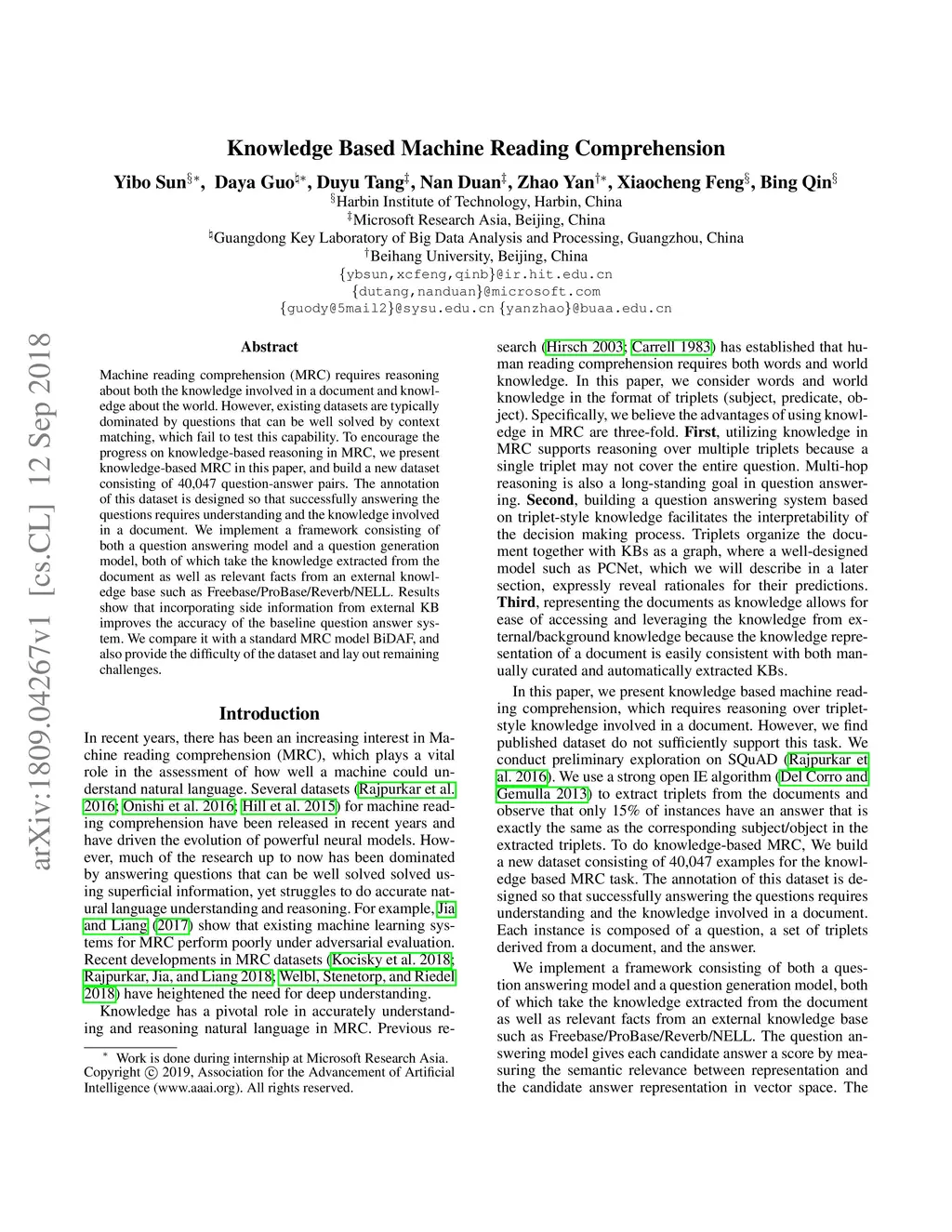 Machine reading comprehension (MRC) requires reasoning about both the knowledge involved in a document and knowledge about the world. However, existing datasets are typically dominated by questions that can be well solved by context matching, which fail to test this capability. To encourage the progress on knowledge-based reasoning in MRC, we present knowledge-based MRC in this paper, and build a new dataset consisting of 40,047 question-answer pairs. The annotation of this dataset is designed so that successfully answering the questions requires understanding and the knowledge involved in a document. We implement a framework consisting of both a question answering model and a question generation model, both of which take the knowledge extracted from the document as well as relevant facts from an external knowledge base such as Freebase/ProBase/Reverb/NELL. Results show that incorporating side information from external KB improves the accuracy of the baseline question answer system. We compare it with a standard MRC model BiDAF, and also provide the difficulty of the dataset and lay out remaining challenges.