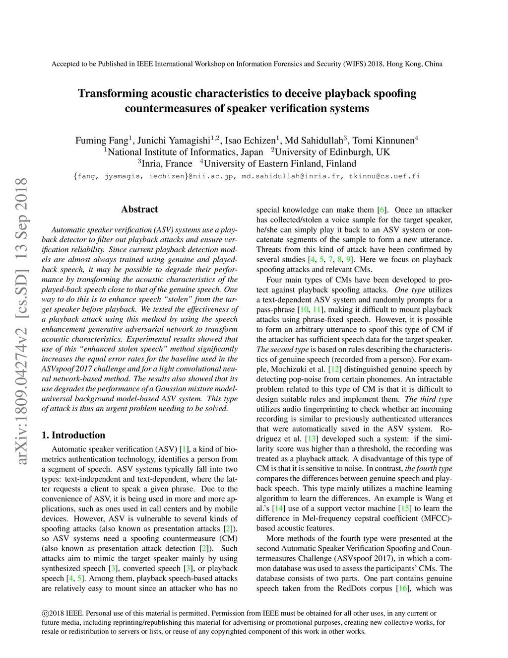 Transforming acoustic characteristics to deceive playback spoofing