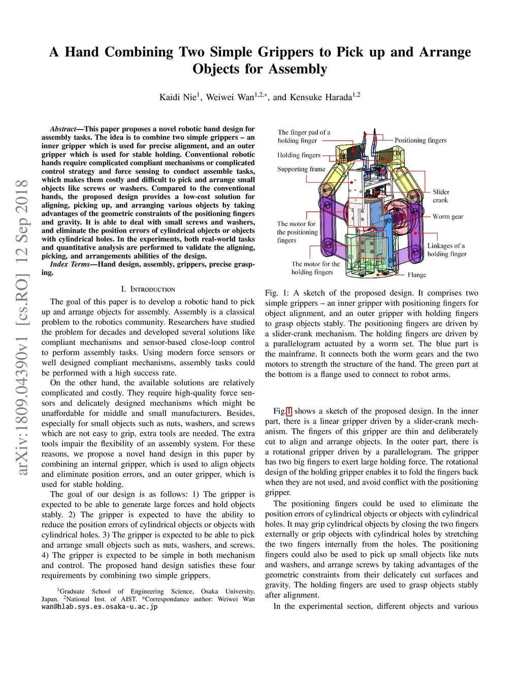 This paper proposes a novel robotic hand design for assembly tasks. The idea is to combine two simple grippers -- an inner gripper which is used for precise alignment, and an outer gripper which is used for stable holding. Conventional robotic hands require complicated compliant mechanisms or complicated control strategy and force sensing to conduct assemble tasks, which makes them costly and difficult to pick and arrange small objects like screws or washers. Compared to the conventional hands, the proposed design provides a low-cost solution for aligning, picking up, and arranging various objects by taking advantages of the geometric constraints of the positioning fingers and gravity. It is able to deal with small screws and washers, and eliminate the position errors of cylindrical objects or objects with cylindrical holes. In the experiments, both real-world tasks and quantitative analysis are performed to validate the aligning, picking, and arrangements abilities of the design.