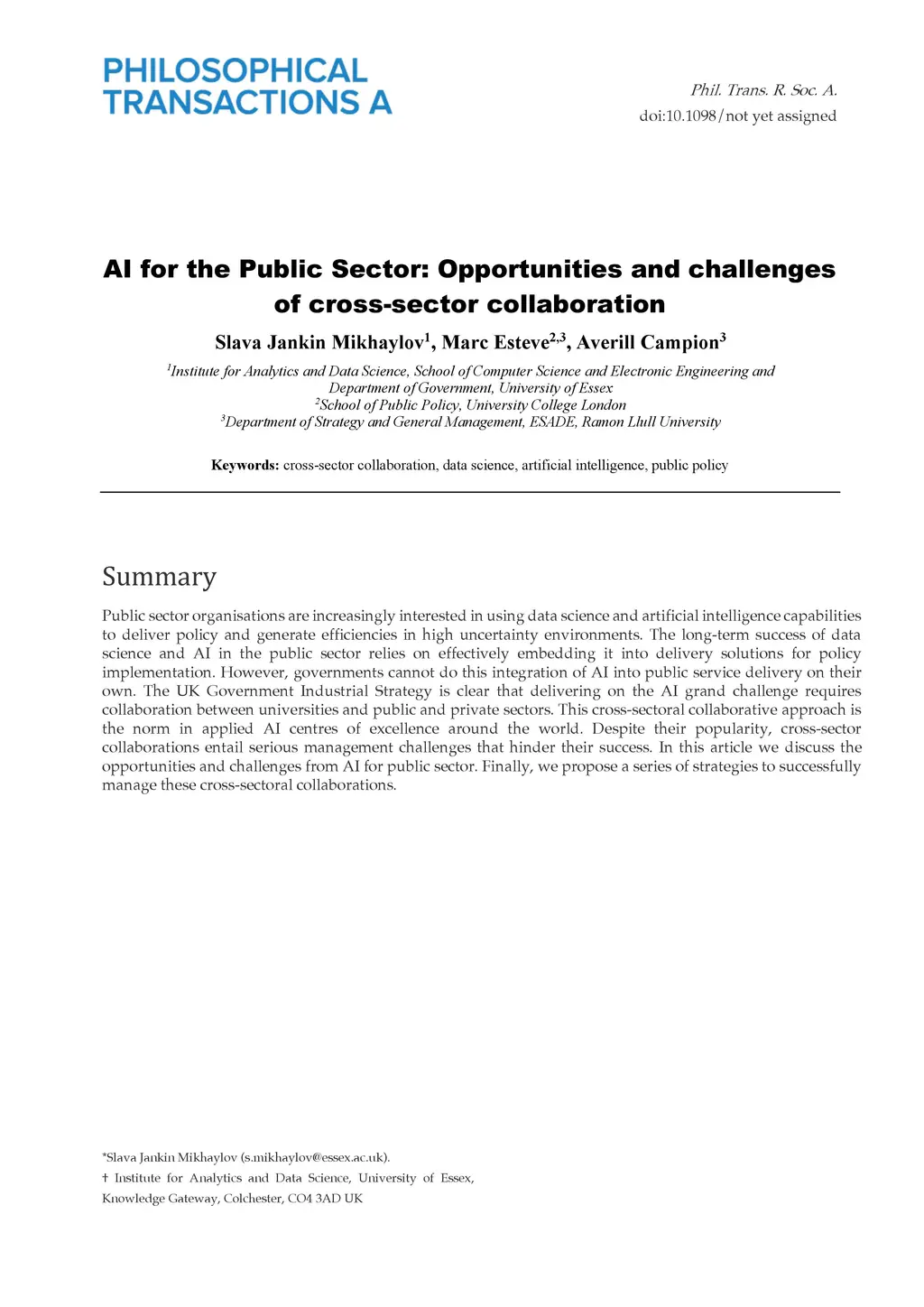 Public sector organisations are increasingly interested in using data science and artificial intelligence capabilities to deliver policy and generate efficiencies in high uncertainty environments. The long-term success of data science and AI in the public sector relies on effectively embedding it into delivery solutions for policy implementation. However, governments cannot do this integration of AI into public service delivery on their own. The UK Government Industrial Strategy is clear that delivering on the AI grand challenge requires collaboration between universities and public and private sectors. This cross-sectoral collaborative approach is the norm in applied AI centres of excellence around the world. Despite their popularity, cross-sector collaborations entail serious management challenges that hinder their success. In this article we discuss the opportunities and challenges from AI for public sector. Finally, we propose a series of strategies to successfully manage these cross-sectoral collaborations.