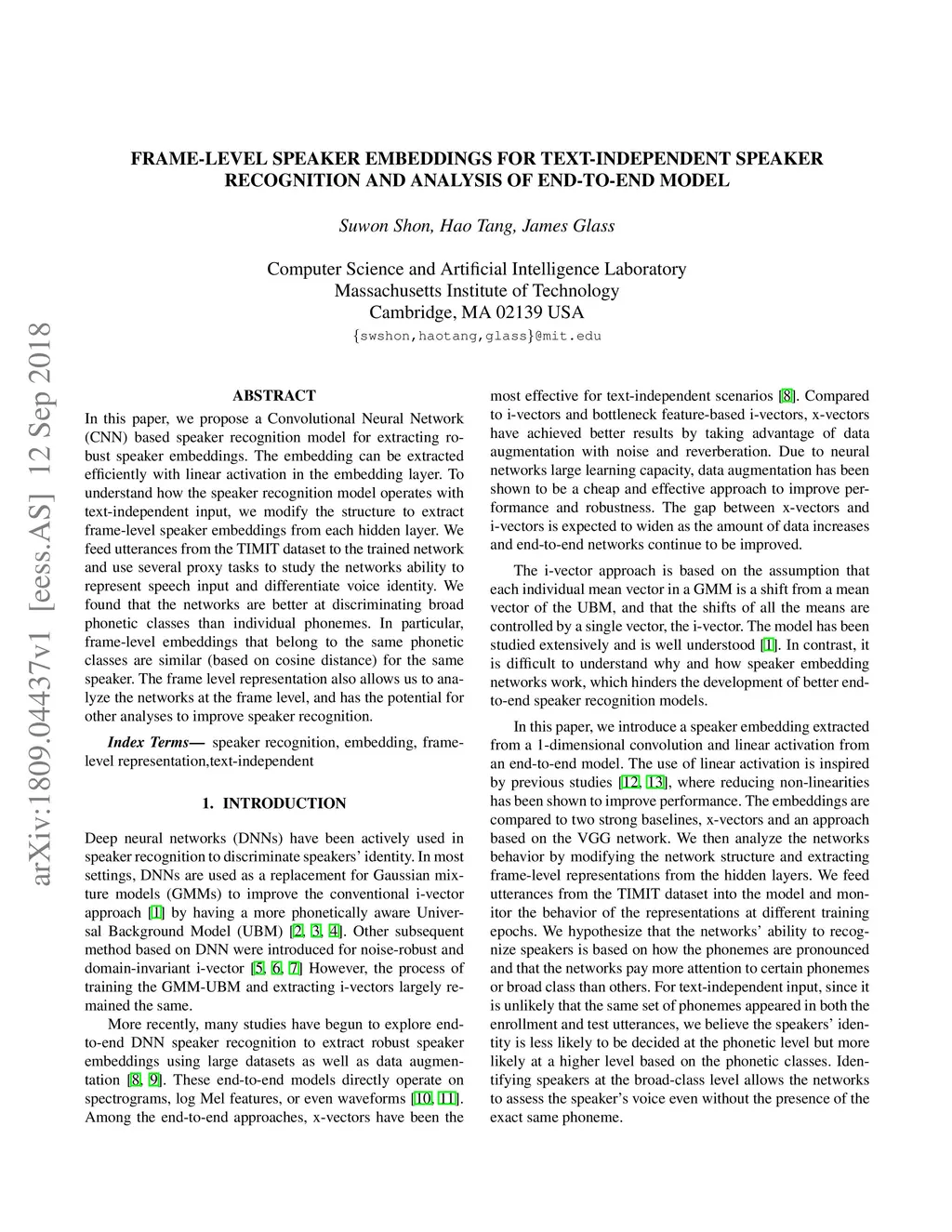 In this paper, we propose a Convolutional Neural Network (CNN) based speaker recognition model for extracting robust speaker embeddings. The embedding can be extracted efficiently with linear activation in the embedding layer. To understand how the speaker recognition model operates with text-independent input, we modify the structure to extract frame-level speaker embeddings from each hidden layer. We feed utterances from the TIMIT dataset to the trained network and use several proxy tasks to study the networks ability to represent speech input and differentiate voice identity. We found that the networks are better at discriminating broad phonetic classes than individual phonemes. In particular, frame-level embeddings that belong to the same phonetic classes are similar (based on cosine distance) for the same speaker. The frame level representation also allows us to analyze the networks at the frame level, and has the potential for other analyses to improve speaker recognition.