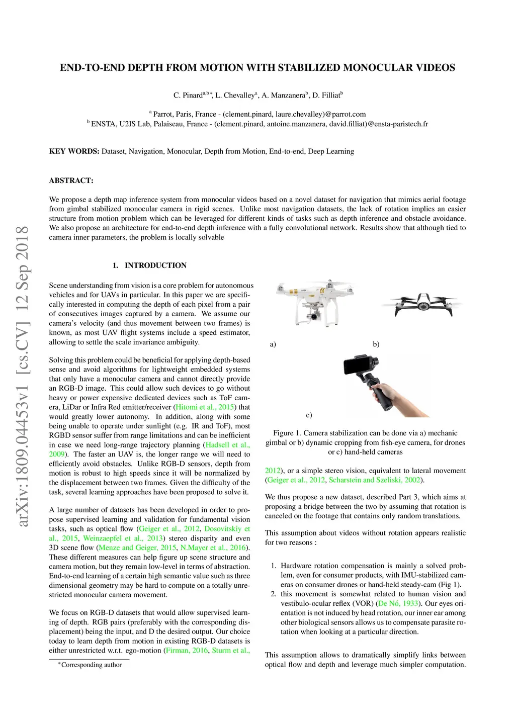 We propose a depth map inference system from monocular videos based on a novel dataset for navigation that mimics aerial footage from gimbal stabilized monocular camera in rigid scenes. Unlike most navigation datasets, the lack of rotation implies an easier structure from motion problem which can be leveraged for different kinds of tasks such as depth inference and obstacle avoidance. We also propose an architecture for end-to-end depth inference with a fully convolutional network. Results show that although tied to camera inner parameters, the problem is locally solvable and leads to good quality depth prediction.