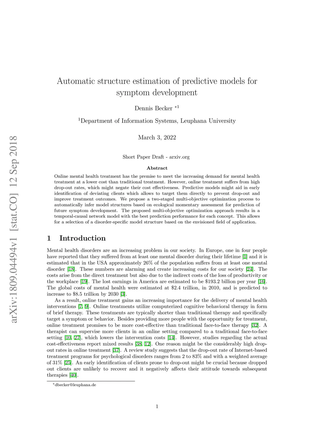 Online mental health treatment has the premise to meet the increasing demand for mental health treatment at a lower cost than traditional treatment. However, online treatment suffers from high drop-out rates, which might negate their cost effectiveness. Predictive models might aid in early identification of deviating clients which allows to target them directly to prevent drop-out and improve treatment outcomes. We propose a two-staged multi-objective optimization process to automatically infer model structures based on ecological momentary assessment for prediction of future symptom development. The proposed multi-objective optimization approach results in a temporal-causal network model with the best prediction performance for each concept. This allows for a selection of a disorder-specific model structure based on the envisioned field of application.