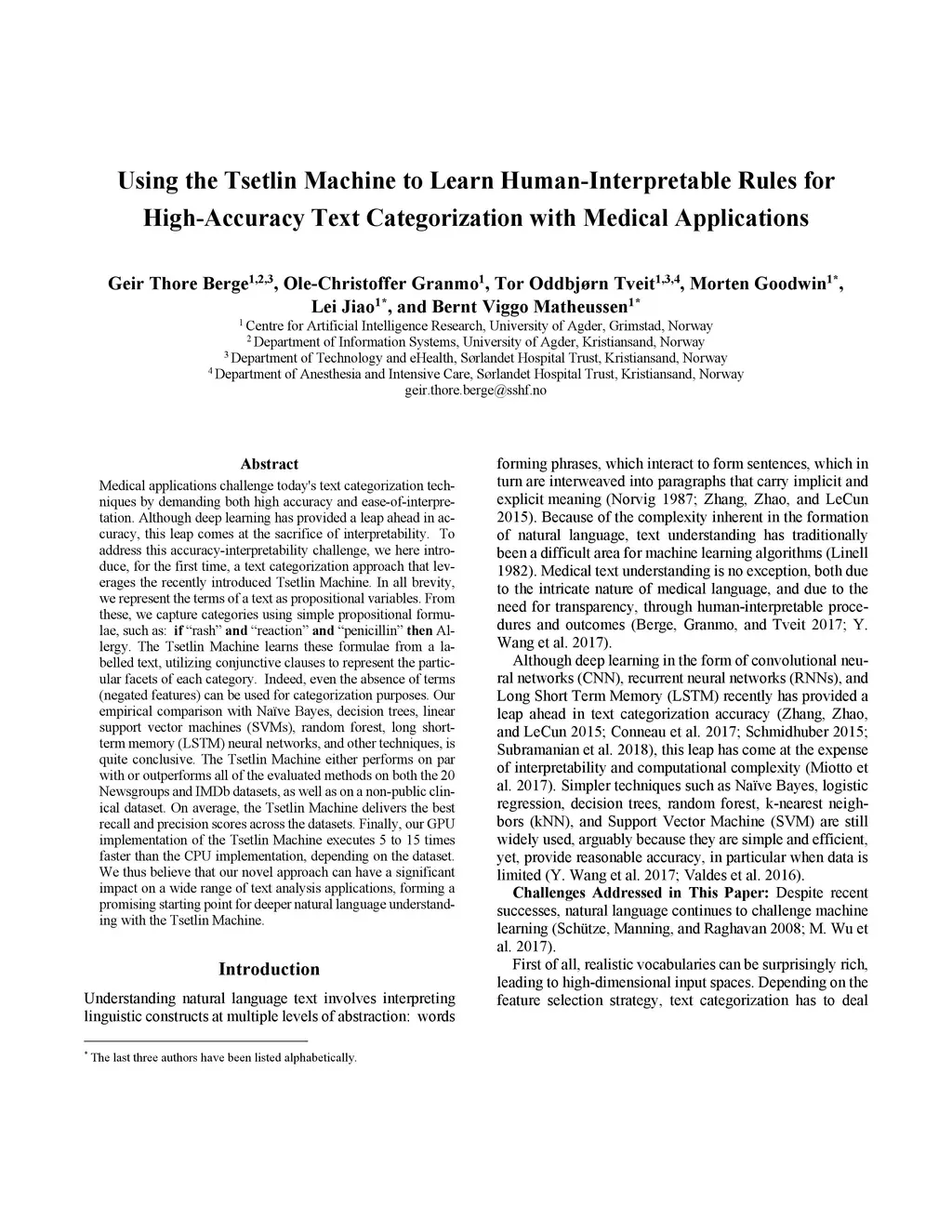 Medical applications challenge today's text categorization techniques by demanding both high accuracy and ease-of-interpretation. Although deep learning has provided a leap ahead in accuracy, this leap comes at the sacrifice of interpretability. To address this accuracy-interpretability challenge, we here introduce, for the first time, a text categorization approach that leverages the recently introduced Tsetlin Machine. In all brevity, we represent the terms of a text as propositional variables. From these, we capture categories using simple propositional formulae, such as: if "rash" and "reaction" and "penicillin" then Allergy. The Tsetlin Machine learns these formulae from a labelled text, utilizing conjunctive clauses to represent the particular facets of each category. Indeed, even the absence of terms (negated features) can be used for categorization purposes. Our empirical comparison with Na\"ive Bayes, decision trees, linear support vector machines (SVMs), random forest, long short-term memory (LSTM) neural networks, and other techniques, is quite conclusive. The Tsetlin Machine either performs on par with or outperforms all of the evaluated methods on both the 20 Newsgroups and IMDb datasets, as well as on a non-public clinical dataset. On average, the Tsetlin Machine delivers the best recall and precision scores across the datasets. Finally, our GPU implementation of the Tsetlin Machine executes 5 to 15 times faster than the CPU implementation, depending on the dataset. We thus believe that our novel approach can have a significant impact on a wide range of text analysis applications, forming a promising starting point for deeper natural language understanding with the Tsetlin Machine.