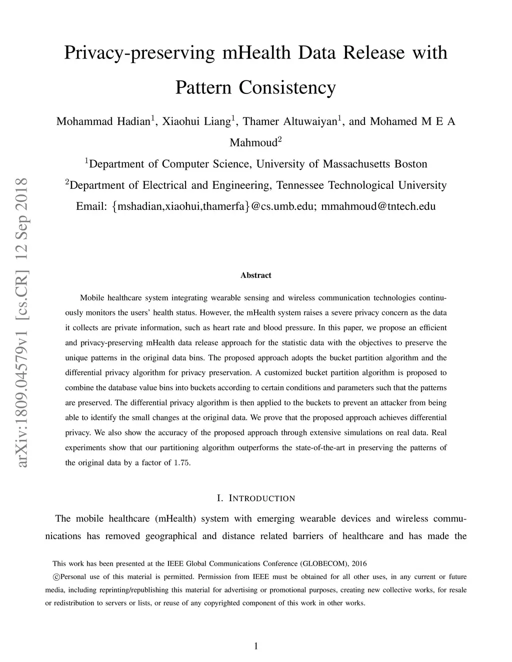 Mobile healthcare system integrating wearable sensing and wireless communication technologies continuously monitors the users' health status. However, the mHealth system raises a severe privacy concern as the data it collects are private information, such as heart rate and blood pressure. In this paper, we propose an efficient and privacy-preserving mHealth data release approach for the statistic data with the objectives to preserve the unique patterns in the original data bins. The proposed approach adopts the bucket partition algorithm and the differential privacy algorithm for privacy preservation. A customized bucket partition algorithm is proposed to combine the database value bins into buckets according to certain conditions and parameters such that the patterns are preserved. The differential privacy algorithm is then applied to the buckets to prevent an attacker from being able to identify the small changes at the original data. We prove that the proposed approach achieves differential privacy. We also show the accuracy of the proposed approach through extensive simulations on real data. Real experiments show that our partitioning algorithm outperforms the state-of-the-art in preserving the patterns of the original data by a factor of 1.75.