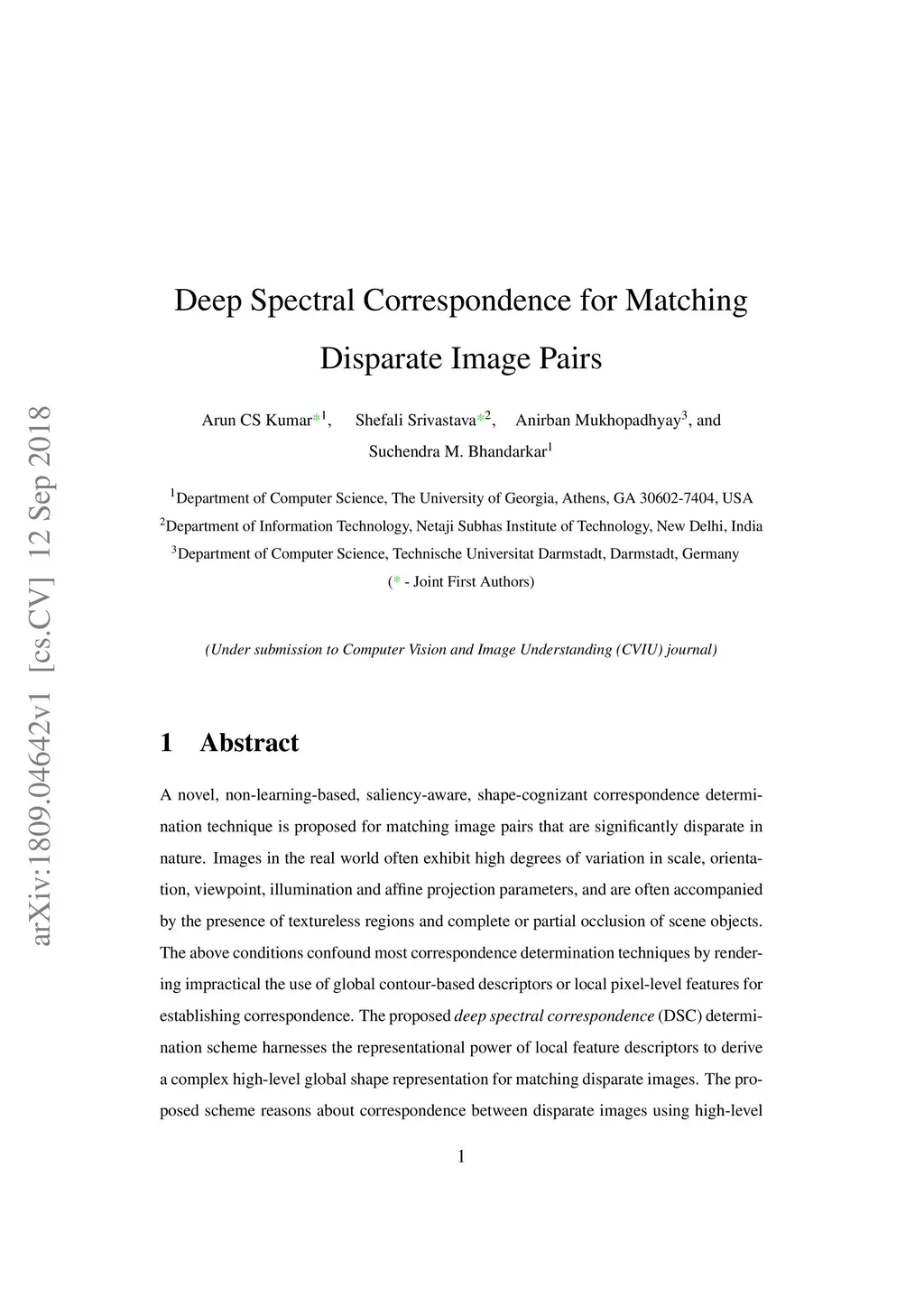 A novel, non-learning-based, saliency-aware, shape-cognizant correspondence determination technique is proposed for matching image pairs that are significantly disparate in nature. Images in the real world often exhibit high degrees of variation in scale, orientation, viewpoint, illumination and affine projection parameters, and are often accompanied by the presence of textureless regions and complete or partial occlusion of scene objects. The above conditions confound most correspondence determination techniques by rendering impractical the use of global contour-based descriptors or local pixel-level features for establishing correspondence. The proposed deep spectral correspondence (DSC) determination scheme harnesses the representational power of local feature descriptors to derive a complex high-level global shape representation for matching disparate images. The proposed scheme reasons about correspondence between disparate images using high-level global shape cues derived from low-level local feature descriptors. Consequently, the proposed scheme enjoys the best of both worlds, i.e., a high degree of invariance to affine parameters such as scale, orientation, viewpoint, illumination afforded by the global shape cues and robustness to occlusion provided by the low-level feature descriptors. While the shape-based component within the proposed scheme infers what to look for, an additional saliency-based component dictates where to look at thereby tackling the noisy correspondences arising from the presence of textureless regions and complex backgrounds. In the proposed scheme, a joint image graph is constructed using distances computed between interest points in the appearance (i.e., image) space. Eigenspectral decomposition of the joint image graph allows for reasoning about shape similarity to be performed jointly, in the appearance space and eigenspace.