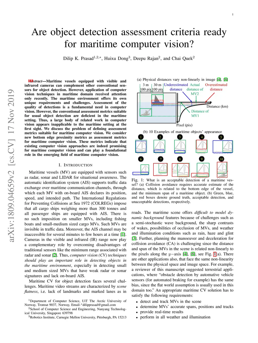 Maritime vessels equipped with visible and infrared cameras can complement other conventional sensors for object detection. However, application of computer vision techniques in maritime domain received attention only recently. The maritime environment offers its own unique requirements and challenges. Assessment of the quality of detections is a fundamental need in computer vision. However, the conventional assessment metrics suitable for usual object detection are deficient in the maritime setting. Thus, a large body of related work in computer vision appears inapplicable to the maritime setting at the first sight. We discuss the problem of defining assessment metrics suitable for maritime computer vision. We consider new bottom edge proximity metrics as assessment metrics for maritime computer vision. These metrics indicate that existing computer vision approaches are indeed promising for maritime computer vision and can play a foundational role in the emerging field of maritime computer vision.
