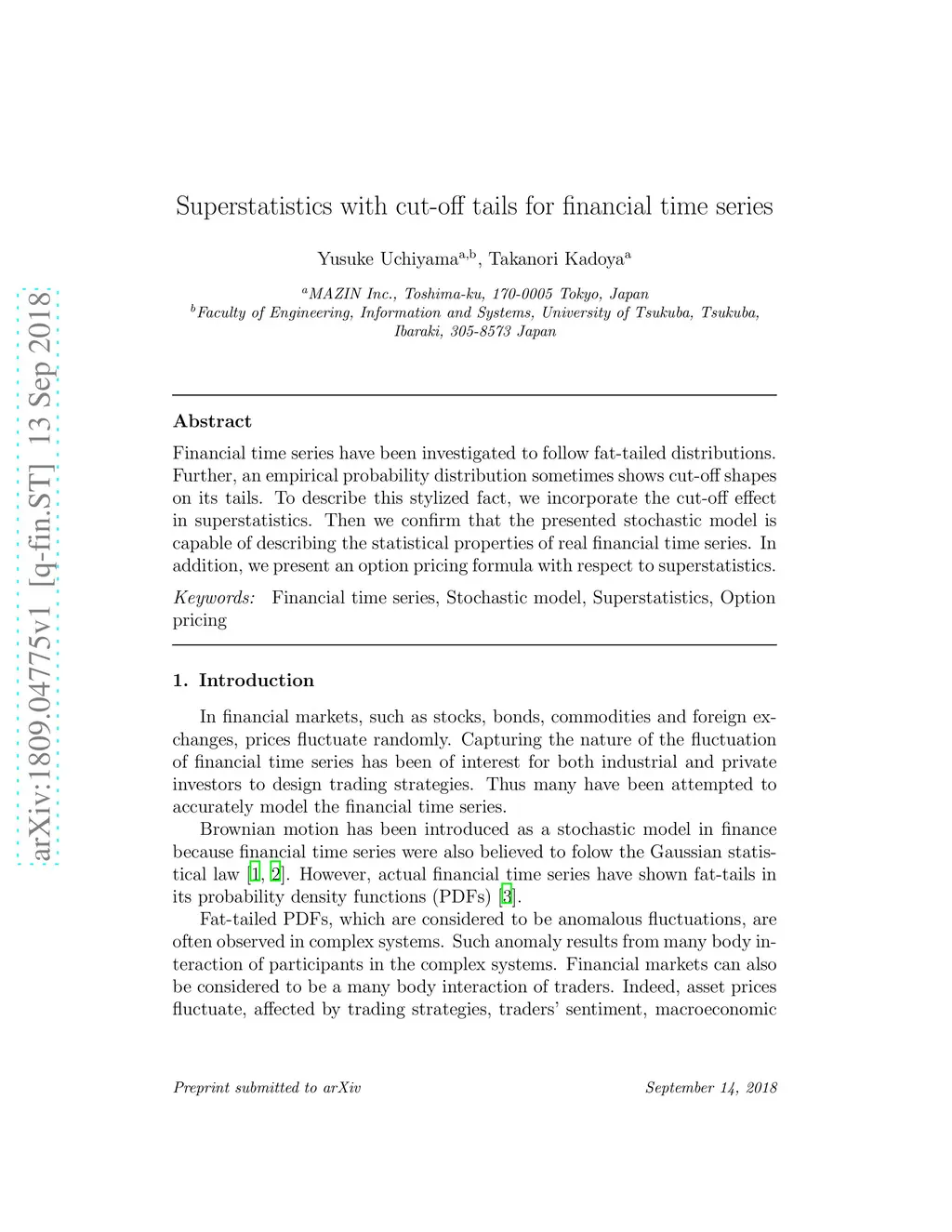 Financial time series have been investigated to follow fat-tailed distributions. Further, an empirical probability distribution sometimes shows cut-off shapes on its tails. To describe this stylized fact, we incorporate the cut-off effect in superstatistics. Then we confirm that the presented stochastic model is capable of describing the statistical properties of real financial time series. In addition, we present an option pricing formula with respect to superstatistics.