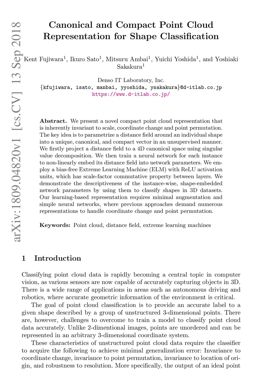We present a novel compact point cloud representation that is inherently invariant to scale, coordinate change and point permutation. The key idea is to parametrize a distance field around an individual shape into a unique, canonical, and compact vector in an unsupervised manner. We firstly project a distance field to a D canonical space using singular value decomposition. We then train a neural network for each instance to non-linearly embed its distance field into network parameters. We employ a bias-free Extreme Learning Machine (ELM) with ReLU activation units, which has scale-factor commutative property between layers. We demonstrate the descriptiveness of the instance-wise, shape-embedded network parameters by using them to classify shapes in D datasets. Our learning-based representation requires minimal augmentation and simple neural networks, where previous approaches demand numerous representations to handle coordinate change and point permutation.