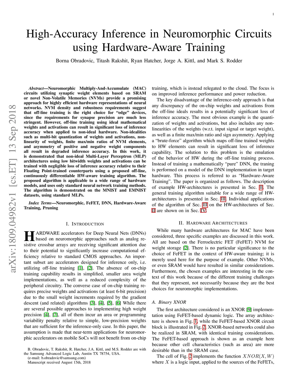 Neuromorphic Multiply-And-Accumulate (MAC) circuits utilizing synaptic weight elements based on SRAM or novel Non-Volatile Memories (NVMs) provide a promising approach for highly efficient hardware representations of neural networks. NVM density and robustness requirements suggest that off-line training is the right choice for "edge" devices, since the requirements for synapse precision are much less stringent. However, off-line training using ideal mathematical weights and activations can result in significant loss of inference accuracy when applied to non-ideal hardware. Non-idealities such as multi-bit quantization of weights and activations, non-linearity of weights, finite max/min ratios of NVM elements, and asymmetry of positive and negative weight components all result in degraded inference accuracy. In this work, it is demonstrated that non-ideal Multi-Layer Perceptron (MLP) architectures using low bitwidth weights and activations can be trained with negligible loss of inference accuracy relative to their Floating Point-trained counterparts using a proposed off-line, continuously differentiable HW-aware training algorithm. The proposed algorithm is applicable to a wide range of hardware models, and uses only standard neural network training methods. The algorithm is demonstrated on the MNIST and EMNIST datasets, using standard MLPs.