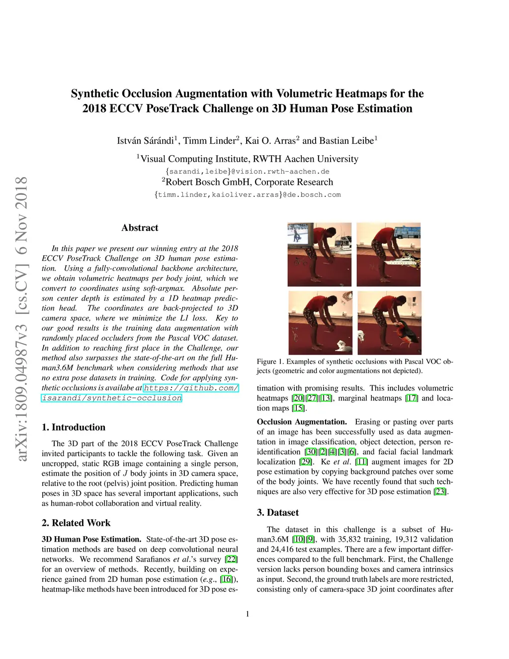 Synthetic Occlusion Augmentation with Volumetric Heatmaps for the 2018