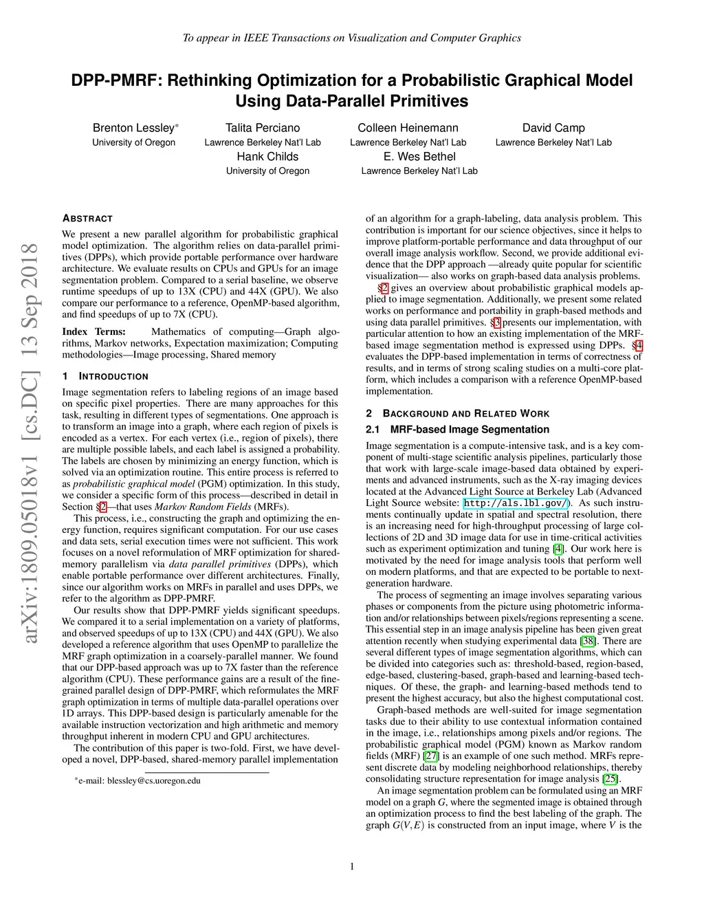 We present a new parallel algorithm for probabilistic graphical model optimization. The algorithm relies on data-parallel primitives (DPPs), which provide portable performance over hardware architecture. We evaluate results on CPUs and GPUs for an image segmentation problem. Compared to a serial baseline, we observe runtime speedups of up to 13X (CPU) and 44X (GPU). We also compare our performance to a reference, OpenMP-based algorithm, and find speedups of up to 7X (CPU).
