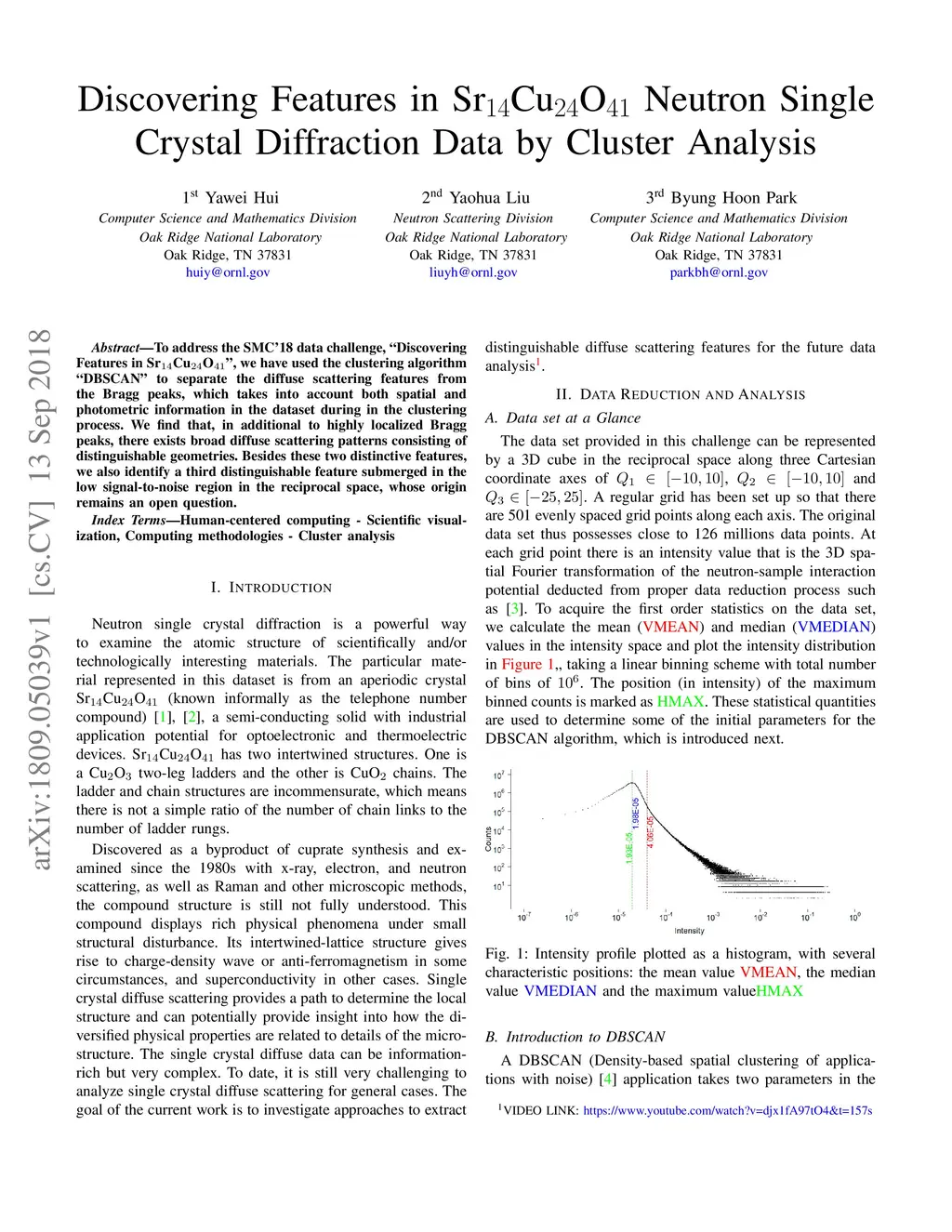 To address the SMC'18 data challenge, "Discovering Features in SrCuO", we have used the clustering algorithm "DBSCAN" to separate the diffuse scattering features from the Bragg peaks, which takes into account both spatial and photometric information in the dataset during in the clustering process. We find that, in additional to highly localized Bragg peaks, there exists broad diffuse scattering patterns consisting of distinguishable geometries. Besides these two distinctive features, we also identify a third distinguishable feature submerged in the low signal-to-noise region in the reciprocal space, whose origin remains an open question.