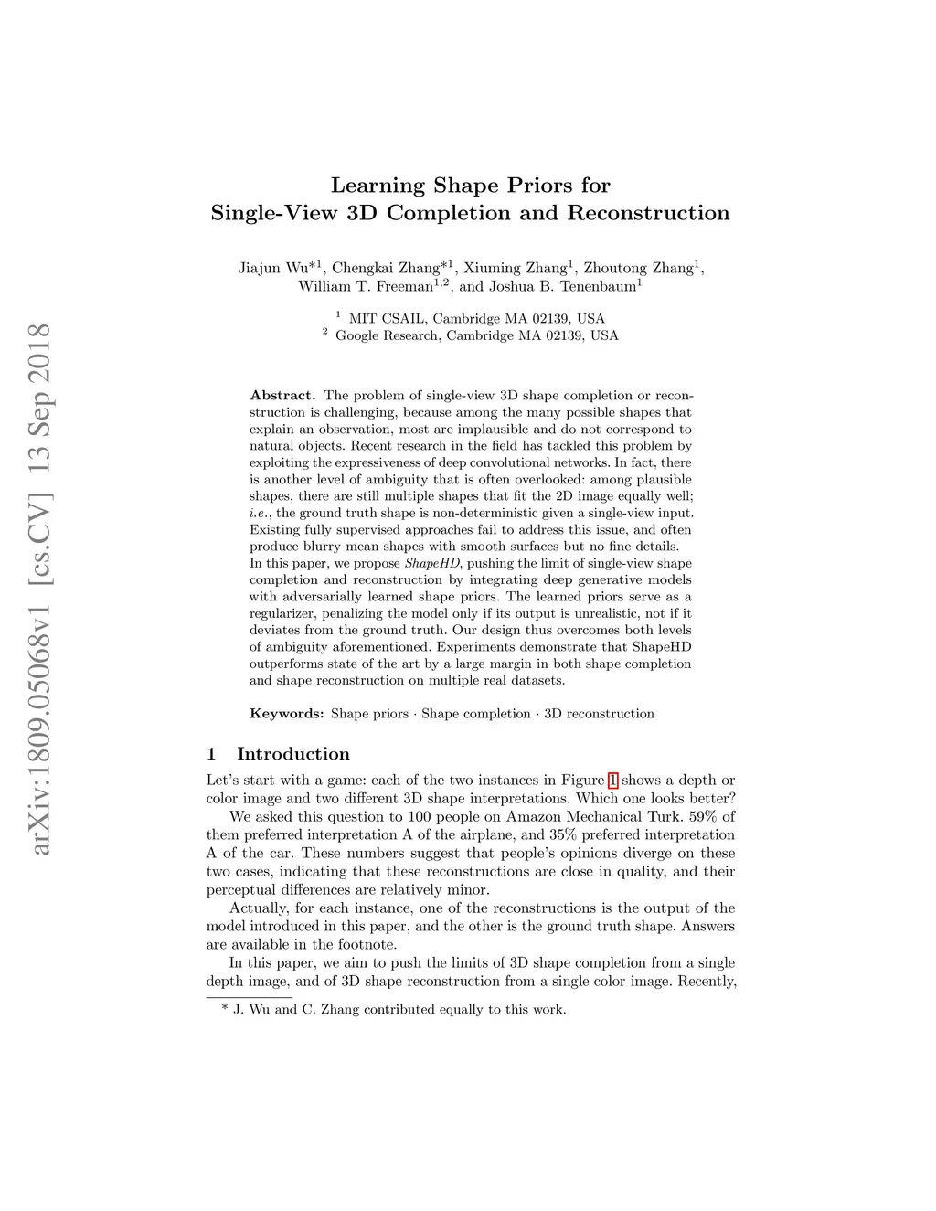 The problem of single-view 3D shape completion or reconstruction is challenging, because among the many possible shapes that explain an observation, most are implausible and do not correspond to natural objects. Recent research in the field has tackled this problem by exploiting the expressiveness of deep convolutional networks. In fact, there is another level of ambiguity that is often overlooked: among plausible shapes, there are still multiple shapes that fit the 2D image equally well; i.e., the ground truth shape is non-deterministic given a single-view input. Existing fully supervised approaches fail to address this issue, and often produce blurry mean shapes with smooth surfaces but no fine details. In this paper, we propose ShapeHD, pushing the limit of single-view shape completion and reconstruction by integrating deep generative models with adversarially learned shape priors. The learned priors serve as a regularizer, penalizing the model only if its output is unrealistic, not if it deviates from the ground truth. Our design thus overcomes both levels of ambiguity aforementioned. Experiments demonstrate that ShapeHD outperforms state of the art by a large margin in both shape completion and shape reconstruction on multiple real datasets.