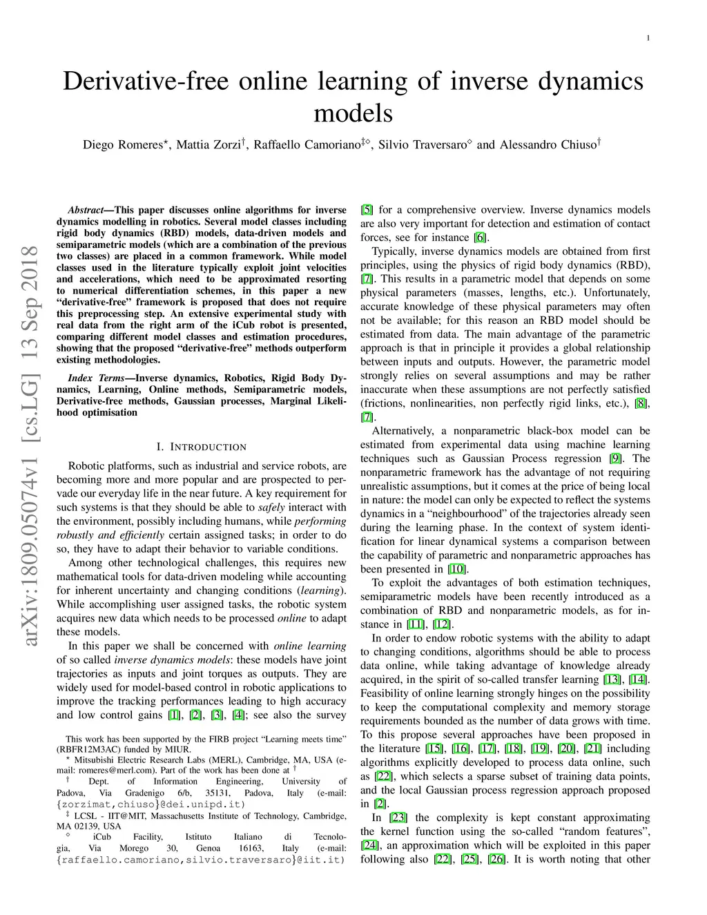 This paper discusses online algorithms for inverse dynamics modelling in robotics. Several model classes including rigid body dynamics (RBD) models, data-driven models and semiparametric models (which are a combination of the previous two classes) are placed in a common framework. While model classes used in the literature typically exploit joint velocities and accelerations, which need to be approximated resorting to numerical differentiation schemes, in this paper a new `derivative-free' framework is proposed that does not require this preprocessing step. An extensive experimental study with real data from the right arm of the iCub robot is presented, comparing different model classes and estimation procedures, showing that the proposed `derivative-free' methods outperform existing methodologies.