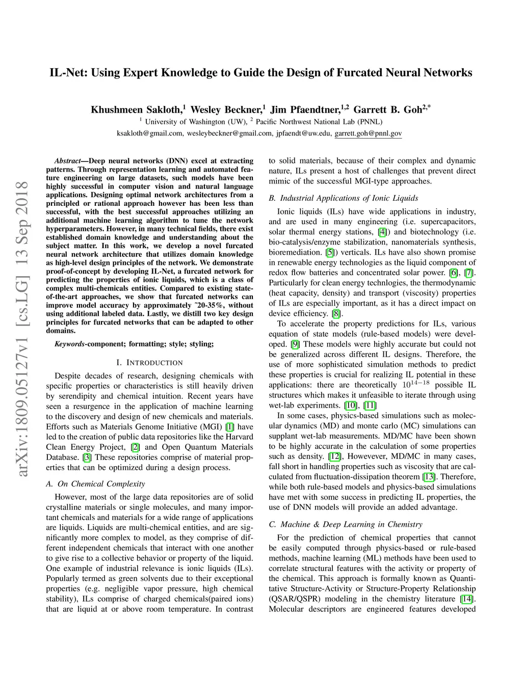 Deep neural networks (DNN) excel at extracting patterns. Through representation learning and automated feature engineering on large datasets, such models have been highly successful in computer vision and natural language applications. Designing optimal network architectures from a principled or rational approach however has been less than successful, with the best successful approaches utilizing an additional machine learning algorithm to tune the network hyperparameters. However, in many technical fields, there exist established domain knowledge and understanding about the subject matter. In this work, we develop a novel furcated neural network architecture that utilizes domain knowledge as high-level design principles of the network. We demonstrate proof-of-concept by developing IL-Net, a furcated network for predicting the properties of ionic liquids, which is a class of complex multi-chemicals entities. Compared to existing state-of-the-art approaches, we show that furcated networks can improve model accuracy by approximately 20-35%, without using additional labeled data. Lastly, we distill two key design principles for furcated networks that can be adapted to other domains.