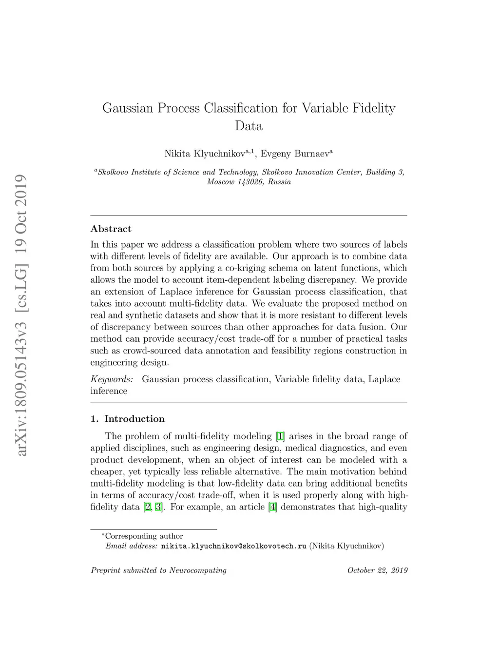 In this paper we address a classification problem where two sources of labels with different levels of fidelity are available. Our approach is to combine data from both sources by applying a co-kriging schema on latent functions, which allows the model to account item-dependent labeling discrepancy. We provide an extension of Laplace inference for Gaussian process classification, that takes into account multi-fidelity data. We evaluate the proposed method on real and synthetic datasets and show that it is more resistant to different levels of discrepancy between sources than other approaches for data fusion. Our method can provide accuracy/cost trade-off for a number of practical tasks such as crowd-sourced data annotation and feasibility regions construction in engineering design.