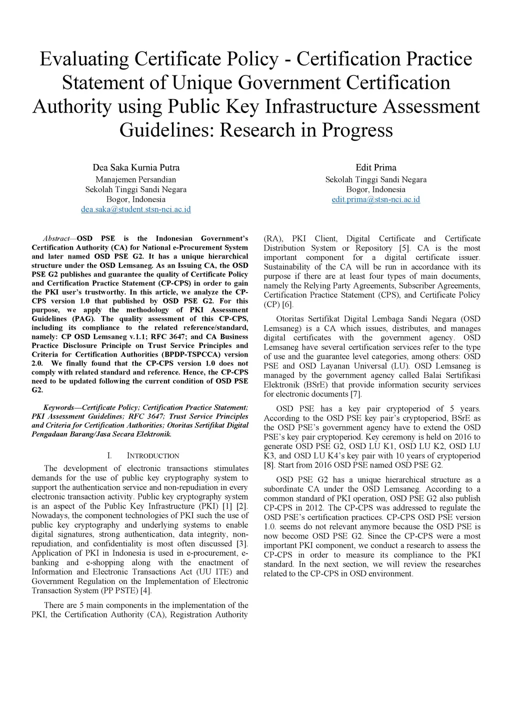 OSD PSE is the Indonesian Government Certification Authority (CA) for National e-Procurement System and later named OSD PSE G2. It has a unique hierarchical structure under the OSD Lemsaneg. As an Issuing CA, the OSD PSE G2 publishes and guarantee the quality of the Certificate Policy and Certification Practice Statement (CP-CPS) in order to gain the PKI user trustworthy. In this article, we analyze the CP-CPS version 1.0 that published by OSD PSE G2. For this purpose, we apply the methodology of PKI Assessment Guidelines (PAG). The quality assessment of this CP-CPS, including its compliance to the related reference/standard, namely: CP OSD Lemsaneg v.1.1; RFC 3647; and CA Business Practice Disclosure Principle on Trust Service Principles and Criteria for Certification Authorities (BPDP-TSPCCA) version 2.0. We finally found that the CP-CPS version 1.0 does not comply with related standard and reference. Hence, the CP-CPS need to be updated following the current condition of OSD PSE G2.