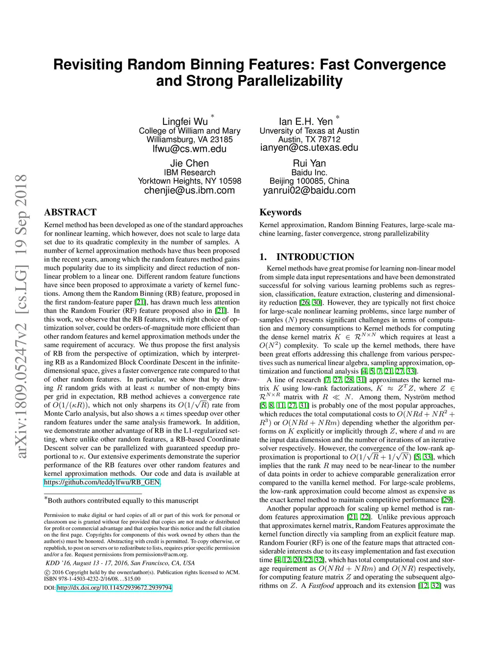 Kernel method has been developed as one of the standard approaches for nonlinear learning, which however, does not scale to large data set due to its quadratic complexity in the number of samples. A number of kernel approximation methods have thus been proposed in the recent years, among which the random features method gains much popularity due to its simplicity and direct reduction of nonlinear problem to a linear one. The Random Binning (RB) feature, proposed in the first random-feature paper \cite{rahimi2007random}, has drawn much less attention than the Random Fourier (RF) feature. In this work, we observe that the RB features, with right choice of optimization solver, could be orders-of-magnitude more efficient than other random features and kernel approximation methods under the same requirement of accuracy. We thus propose the first analysis of RB from the perspective of optimization, which by interpreting RB as a Randomized Block Coordinate Descent in the infinite-dimensional space, gives a faster convergence rate compared to that of other random features. In particular, we show that by drawing random grids with at least number of non-empty bins per grid in expectation, RB method achieves a convergence rate of , which not only sharpens its rate from Monte Carlo analysis, but also shows a times speedup over other random features under the same analysis framework. In addition, we demonstrate another advantage of RB in the L1-regularized setting, where unlike other random features, a RB-based Coordinate Descent solver can be parallelized with guaranteed speedup proportional to . Our extensive experiments demonstrate the superior performance of the RB features over other random features and kernel approximation methods. Our code and data is available at { \url{https://github.com/teddylfwu/RB_GEN}}.