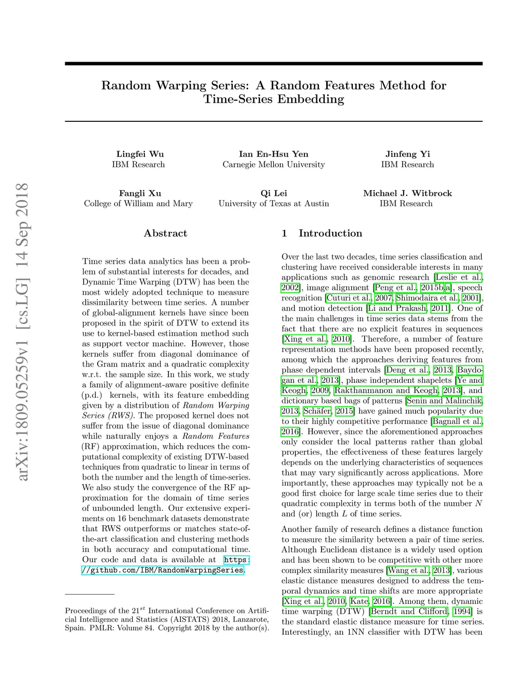 Time series data analytics has been a problem of substantial interests for decades, and Dynamic Time Warping (DTW) has been the most widely adopted technique to measure dissimilarity between time series. A number of global-alignment kernels have since been proposed in the spirit of DTW to extend its use to kernel-based estimation method such as support vector machine. However, those kernels suffer from diagonal dominance of the Gram matrix and a quadratic complexity w.r.t. the sample size. In this work, we study a family of alignment-aware positive definite (p.d.) kernels, with its feature embedding given by a distribution of \emph{Random Warping Series (RWS)}. The proposed kernel does not suffer from the issue of diagonal dominance while naturally enjoys a \emph{Random Features} (RF) approximation, which reduces the computational complexity of existing DTW-based techniques from quadratic to linear in terms of both the number and the length of time-series. We also study the convergence of the RF approximation for the domain of time series of unbounded length. Our extensive experiments on 16 benchmark datasets demonstrate that RWS outperforms or matches state-of-the-art classification and clustering methods in both accuracy and computational time. Our code and data is available at { \url{https://github.com/IBM/RandomWarpingSeries}}.