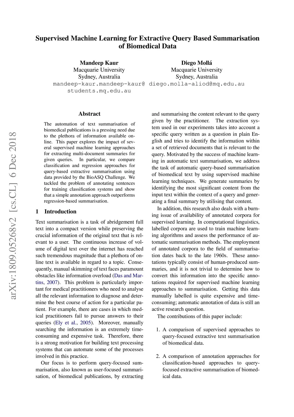 The automation of text summarisation of biomedical publications is a pressing need due to the plethora of information available on-line. This paper explores the impact of several supervised machine learning approaches for extracting multi-document summaries for given queries. In particular, we compare classification and regression approaches for query-based extractive summarisation using data provided by the BioASQ Challenge. We tackled the problem of annotating sentences for training classification systems and show that a simple annotation approach outperforms regression-based summarisation.