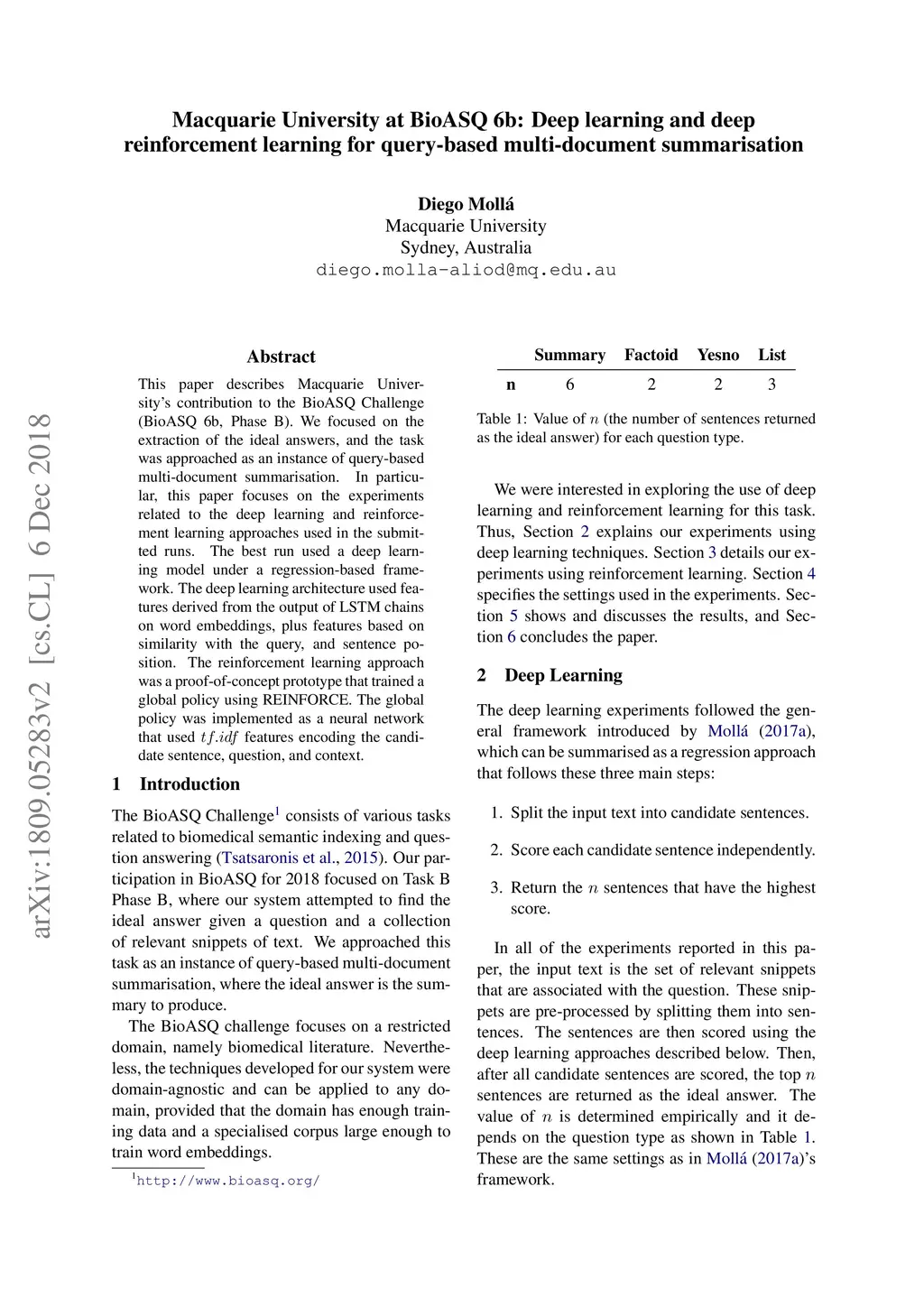 Macquarie University at BioASQ 6b: Deep learning and deep reinforcement
