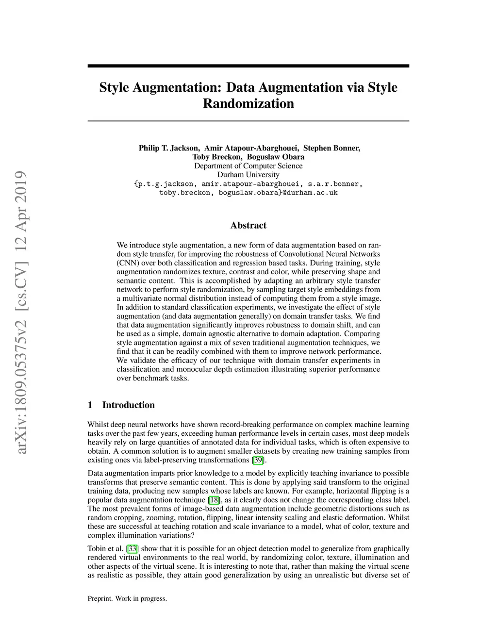 We introduce style augmentation, a new form of data augmentation based on random style transfer, for improving the robustness of convolutional neural networks (CNN) over both classification and regression based tasks. During training, our style augmentation randomizes texture, contrast and color, while preserving shape and semantic content. This is accomplished by adapting an arbitrary style transfer network to perform style randomization, by sampling input style embeddings from a multivariate normal distribution instead of inferring them from a style image. In addition to standard classification experiments, we investigate the effect of style augmentation (and data augmentation generally) on domain transfer tasks. We find that data augmentation significantly improves robustness to domain shift, and can be used as a simple, domain agnostic alternative to domain adaptation. Comparing style augmentation against a mix of seven traditional augmentation techniques, we find that it can be readily combined with them to improve network performance. We validate the efficacy of our technique with domain transfer experiments in classification and monocular depth estimation, illustrating consistent improvements in generalization.
