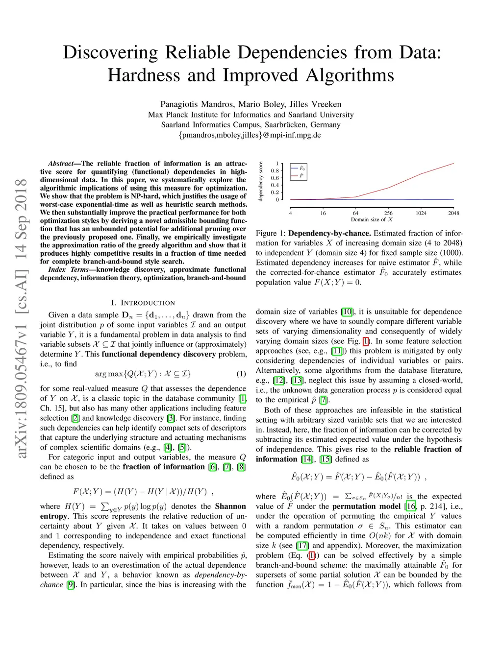 The reliable fraction of information is an attractive score for quantifying (functional) dependencies in high-dimensional data. In this paper, we systematically explore the algorithmic implications of using this measure for optimization. We show that the problem is NP-hard, which justifies the usage of worst-case exponential-time as well as heuristic search methods. We then substantially improve the practical performance for both optimization styles by deriving a novel admissible bounding function that has an unbounded potential for additional pruning over the previously proposed one. Finally, we empirically investigate the approximation ratio of the greedy algorithm and show that it produces highly competitive results in a fraction of time needed for complete branch-and-bound style search.