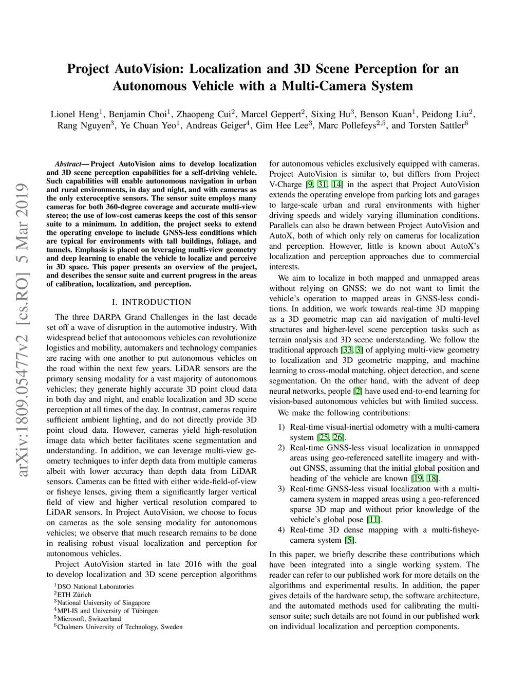 Project AutoVision aims to develop localization and 3D scene perception capabilities for a self-driving vehicle. Such capabilities will enable autonomous navigation in urban and rural environments, in day and night, and with cameras as the only exteroceptive sensors. The sensor suite employs many cameras for both 360-degree coverage and accurate multi-view stereo; the use of low-cost cameras keeps the cost of this sensor suite to a minimum. In addition, the project seeks to extend the operating envelope to include GNSS-less conditions which are typical for environments with tall buildings, foliage, and tunnels. Emphasis is placed on leveraging multi-view geometry and deep learning to enable the vehicle to localize and perceive in 3D space. This paper presents an overview of the project, and describes the sensor suite and current progress in the areas of calibration, localization, and perception.