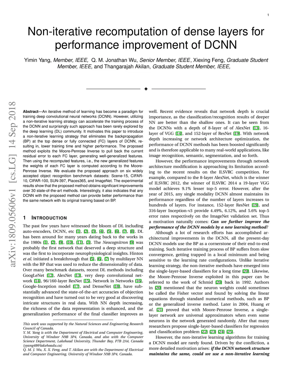 An iterative method of learning has become a paradigm for training deep convolutional neural networks (DCNN). However, utilizing a non-iterative learning strategy can accelerate the training process of the DCNN and surprisingly such approach has been rarely explored by the deep learning (DL) community. It motivates this paper to introduce a non-iterative learning strategy that eliminates the backpropagation (BP) at the top dense or fully connected (FC) layers of DCNN, resulting in, lower training time and higher performance. The proposed method exploits the Moore-Penrose Inverse to pull back the current residual error to each FC layer, generating well-generalized features. Then using the recomputed features, i.e., the new generalized features the weights of each FC layer is computed according to the Moore-Penrose Inverse. We evaluate the proposed approach on six widely accepted object recognition benchmark datasets: Scene-15, CIFAR-10, CIFAR-100, SUN-397, Places365, and ImageNet. The experimental results show that the proposed method obtains significant improvements over 30 state-of-the-art methods. Interestingly, it also indicates that any DCNN with the proposed method can provide better performance than the same network with its original training based on BP.