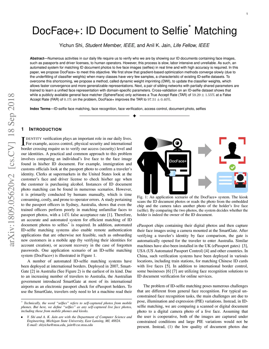 Numerous activities in our daily life require us to verify who we are by showing our ID documents containing face images, such as passports and driver licenses, to human operators. However, this process is slow, labor intensive and unreliable. As such, an automated system for matching ID document photos to live face images (selfies) in real time and with high accuracy is required. In this paper, we propose DocFace+ to meet this objective. We first show that gradient-based optimization methods converge slowly (due to the underfitting of classifier weights) when many classes have very few samples, a characteristic of existing ID-selfie datasets. To overcome this shortcoming, we propose a method, called dynamic weight imprinting (DWI), to update the classifier weights, which allows faster convergence and more generalizable representations. Next, a pair of sibling networks with partially shared parameters are trained to learn a unified face representation with domain-specific parameters. Cross-validation on an ID-selfie dataset shows that while a publicly available general face matcher (SphereFace) only achieves a True Accept Rate (TAR) of 59.29+-1.55% at a False Accept Rate (FAR) of 0.1% on the problem, DocFace+ improves the TAR to 97.51+-0.40%.