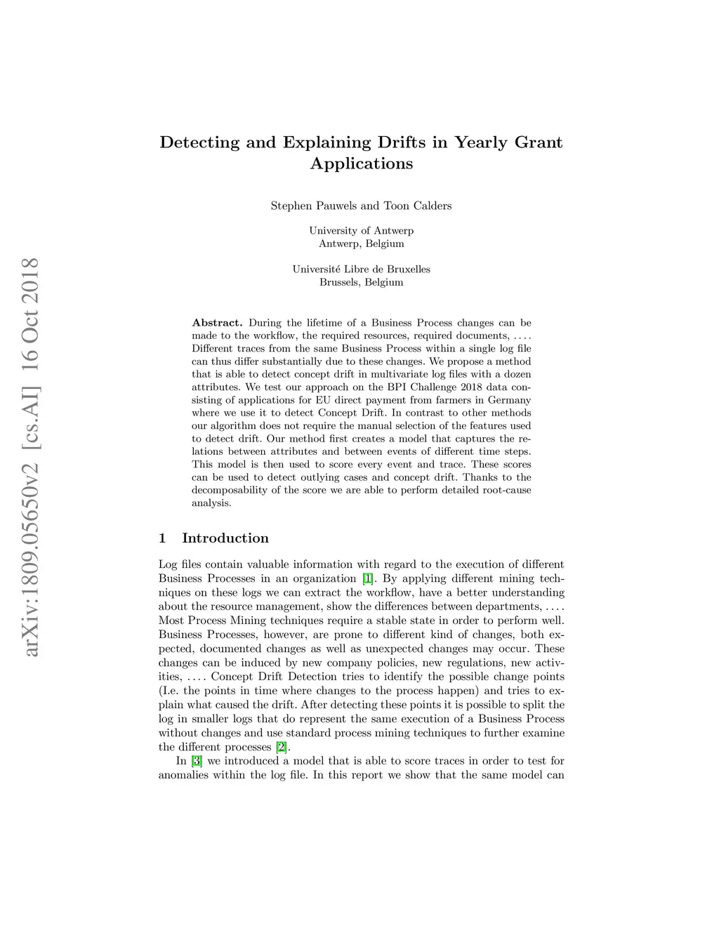 During the lifetime of a Business Process changes can be made to the workflow, the required resources, required documents, . . . . Different traces from the same Business Process within a single log file can thus differ substantially due to these changes. We propose a method that is able to detect concept drift in multivariate log files with a dozen attributes. We test our approach on the BPI Challenge 2018 data con- sisting of applications for EU direct payment from farmers in Germany where we use it to detect Concept Drift. In contrast to other methods our algorithm does not require the manual selection of the features used to detect drift. Our method first creates a model that captures the re- lations between attributes and between events of different time steps. This model is then used to score every event and trace. These scores can be used to detect outlying cases and concept drift. Thanks to the decomposability of the score we are able to perform detailed root-cause analysis.