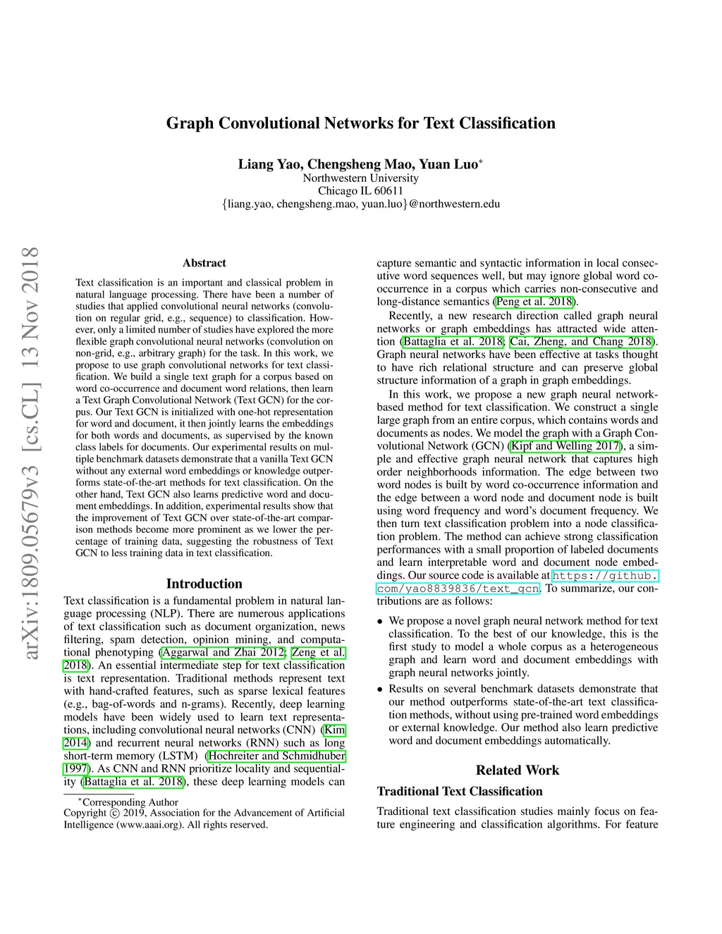 Text classification is an important and classical problem in natural language processing. There have been a number of studies that applied convolutional neural networks (convolution on regular grid, e.g., sequence) to classification. However, only a limited number of studies have explored the more flexible graph convolutional neural networks (convolution on non-grid, e.g., arbitrary graph) for the task. In this work, we propose to use graph convolutional networks for text classification. We build a single text graph for a corpus based on word co-occurrence and document word relations, then learn a Text Graph Convolutional Network (Text GCN) for the corpus. Our Text GCN is initialized with one-hot representation for word and document, it then jointly learns the embeddings for both words and documents, as supervised by the known class labels for documents. Our experimental results on multiple benchmark datasets demonstrate that a vanilla Text GCN without any external word embeddings or knowledge outperforms state-of-the-art methods for text classification. On the other hand, Text GCN also learns predictive word and document embeddings. In addition, experimental results show that the improvement of Text GCN over state-of-the-art comparison methods become more prominent as we lower the percentage of training data, suggesting the robustness of Text GCN to less training data in text classification.