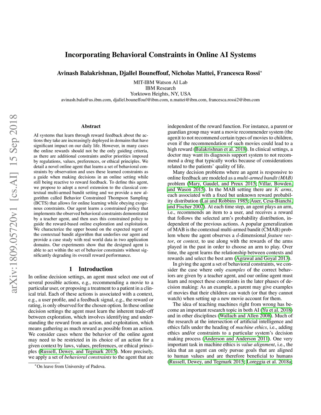 AI systems that learn through reward feedback about the actions they take are increasingly deployed in domains that have significant impact on our daily life. However, in many cases the online rewards should not be the only guiding criteria, as there are additional constraints and/or priorities imposed by regulations, values, preferences, or ethical principles. We detail a novel online agent that learns a set of behavioral constraints by observation and uses these learned constraints as a guide when making decisions in an online setting while still being reactive to reward feedback. To define this agent, we propose to adopt a novel extension to the classical contextual multi-armed bandit setting and we provide a new algorithm called Behavior Constrained Thompson Sampling (BCTS) that allows for online learning while obeying exogenous constraints. Our agent learns a constrained policy that implements the observed behavioral constraints demonstrated by a teacher agent, and then uses this constrained policy to guide the reward-based online exploration and exploitation. We characterize the upper bound on the expected regret of the contextual bandit algorithm that underlies our agent and provide a case study with real world data in two application domains. Our experiments show that the designed agent is able to act within the set of behavior constraints without significantly degrading its overall reward performance.