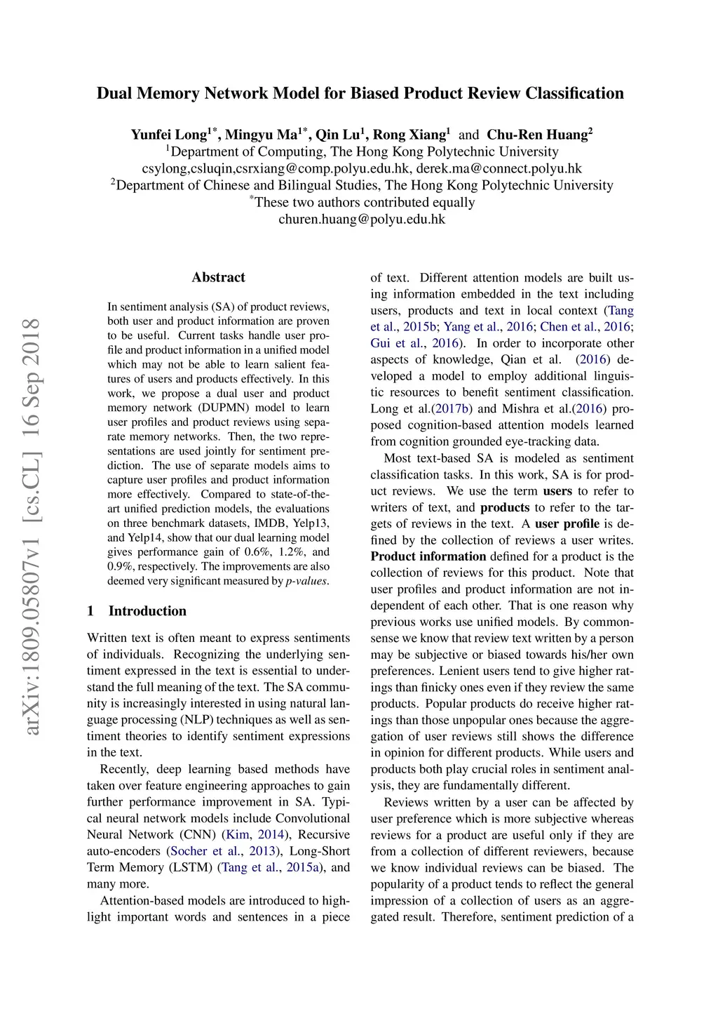 Dual Memory Network Model for Biased Product Review Classification