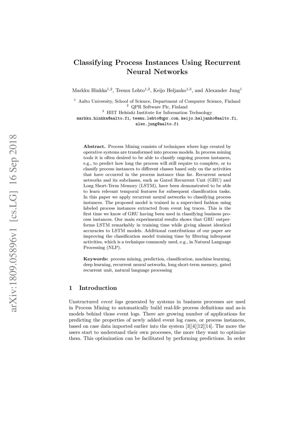 Process Mining consists of techniques where logs created by operative systems are transformed into process models. In process mining tools it is often desired to be able to classify ongoing process instances, e.g., to predict how long the process will still require to complete, or to classify process instances to different classes based only on the activities that have occurred in the process instance thus far. Recurrent neural networks and its subclasses, such as Gated Recurrent Unit (GRU) and Long Short-Term Memory (LSTM), have been demonstrated to be able to learn relevant temporal features for subsequent classification tasks. In this paper we apply recurrent neural networks to classifying process instances. The proposed model is trained in a supervised fashion using labeled process instances extracted from event log traces. This is the first time we know of GRU having been used in classifying business process instances. Our main experimental results shows that GRU outperforms LSTM remarkably in training time while giving almost identical accuracies to LSTM models. Additional contributions of our paper are improving the classification model training time by filtering infrequent activities, which is a technique commonly used, e.g., in Natural Language Processing (NLP).