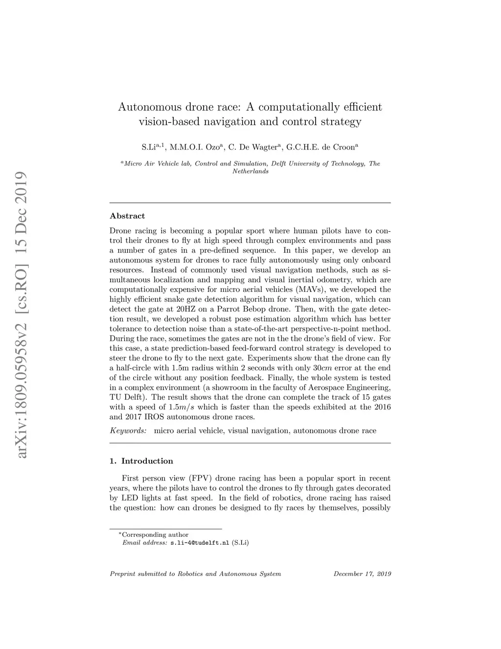 Drone racing is becoming a popular sport where human pilots have to control their drones to fly at high speed through complex environments and pass a number of gates in a pre-defined sequence. In this paper, we develop an autonomous system for drones to race fully autonomously using only onboard resources. Instead of commonly used visual navigation methods, such as simultaneous localization and mapping and visual inertial odometry, which are computationally expensive for micro aerial vehicles (MAVs), we developed the highly efficient snake gate detection algorithm for visual navigation, which can detect the gate at 20HZ on a Parrot Bebop drone. Then, with the gate detection result, we developed a robust pose estimation algorithm which has better tolerance to detection noise than a state-of-the-art perspective-n-point method. During the race, sometimes the gates are not in the drone's field of view. For this case, a state prediction-based feed-forward control strategy is developed to steer the drone to fly to the next gate. Experiments show that the drone can fly a half-circle with 1.5m radius within 2 seconds with only 30cm error at the end of the circle without any position feedback. Finally, the whole system is tested in a complex environment (a showroom in the faculty of Aerospace Engineering, TU Delft). The result shows that the drone can complete the track of 15 gates with a speed of 1.5m/s which is faster than the speeds exhibited at the 2016 and 2017 IROS autonomous drone races.