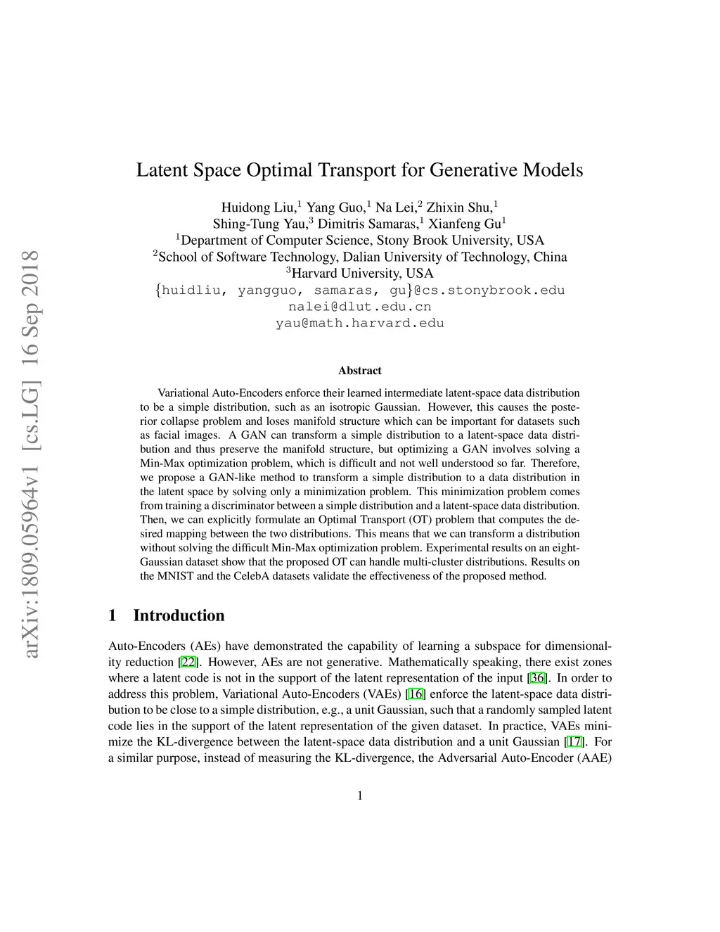 Variational Auto-Encoders enforce their learned intermediate latent-space data distribution to be a simple distribution, such as an isotropic Gaussian. However, this causes the posterior collapse problem and loses manifold structure which can be important for datasets such as facial images. A GAN can transform a simple distribution to a latent-space data distribution and thus preserve the manifold structure, but optimizing a GAN involves solving a Min-Max optimization problem, which is difficult and not well understood so far. Therefore, we propose a GAN-like method to transform a simple distribution to a data distribution in the latent space by solving only a minimization problem. This minimization problem comes from training a discriminator between a simple distribution and a latent-space data distribution. Then, we can explicitly formulate an Optimal Transport (OT) problem that computes the desired mapping between the two distributions. This means that we can transform a distribution without solving the difficult Min-Max optimization problem. Experimental results on an eight-Gaussian dataset show that the proposed OT can handle multi-cluster distributions. Results on the MNIST and the CelebA datasets validate the effectiveness of the proposed method.